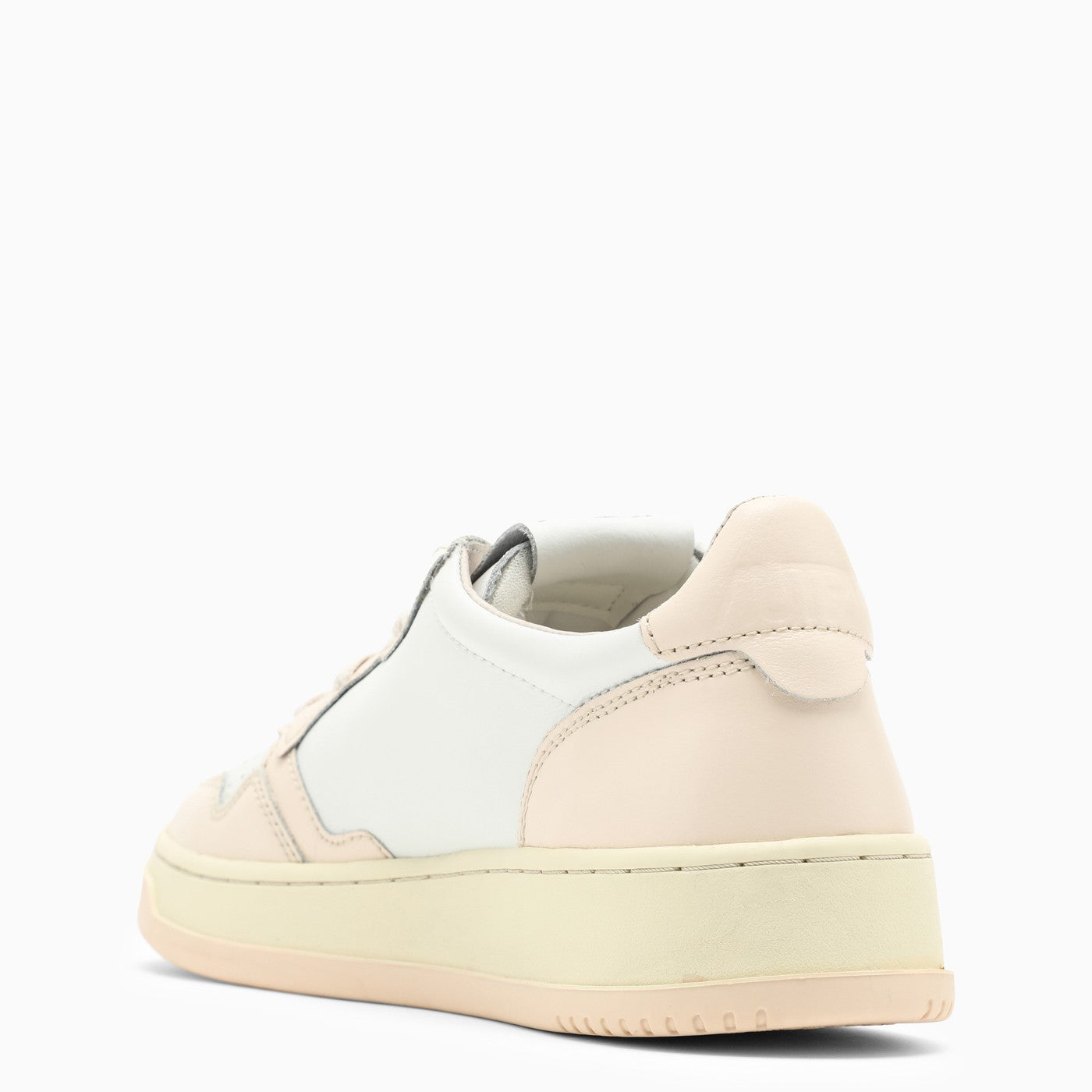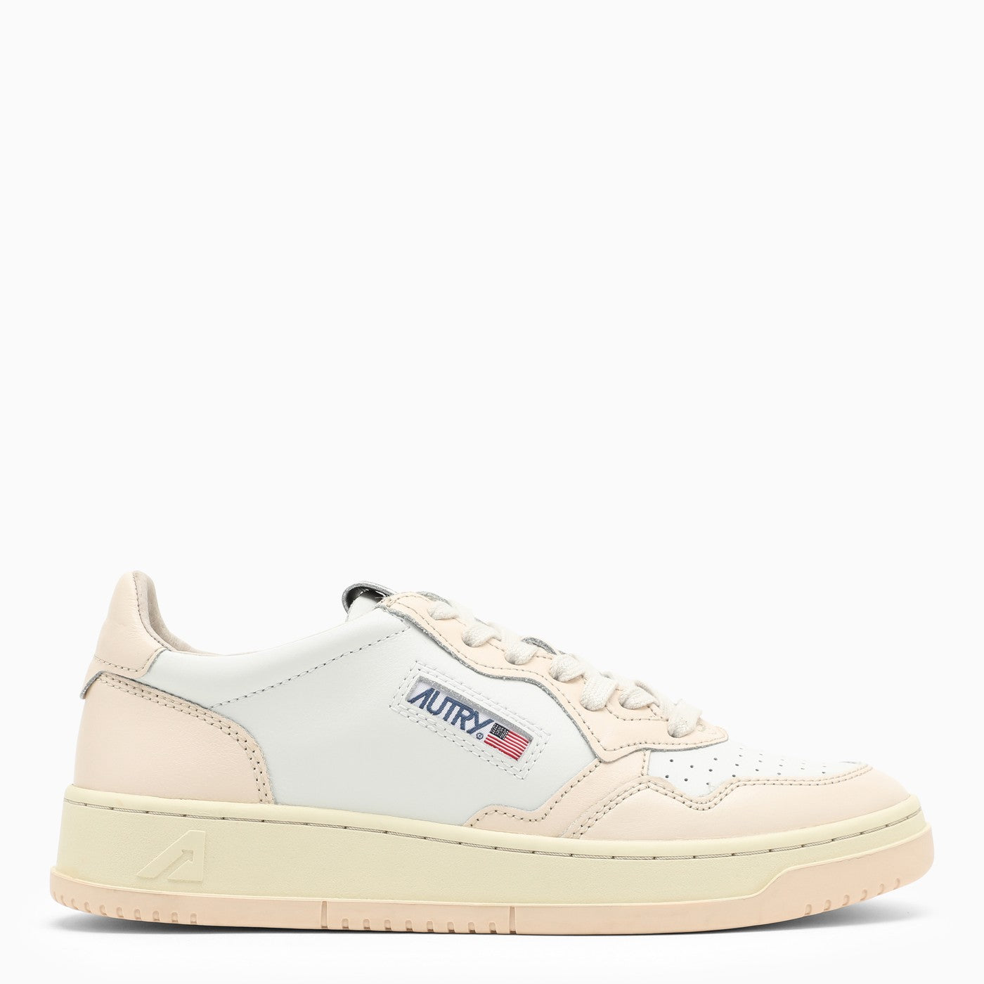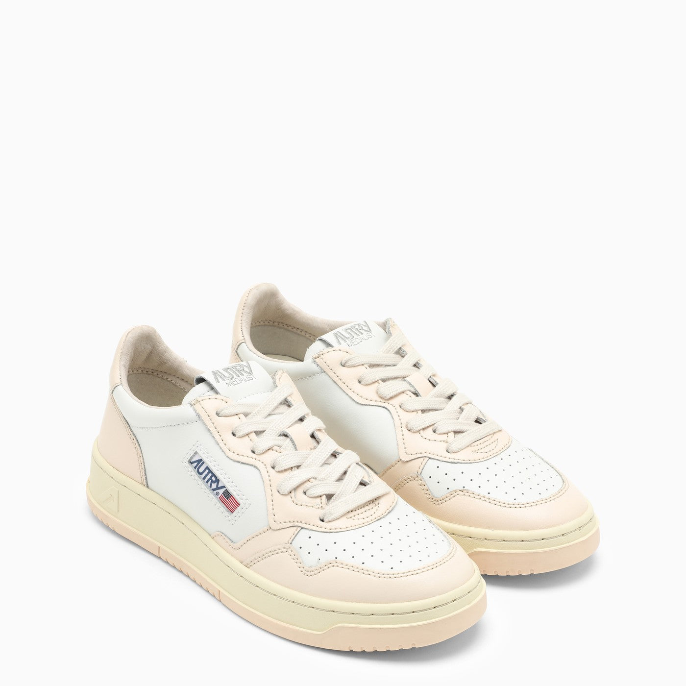 Low-top sneakers by Autry in white and nude leather, featuring perforated toe, front lace up fastening, tonal label seamed on a leather tongue, padded ankle collar, back patch with embossed logo and cream rubber sole with logo.