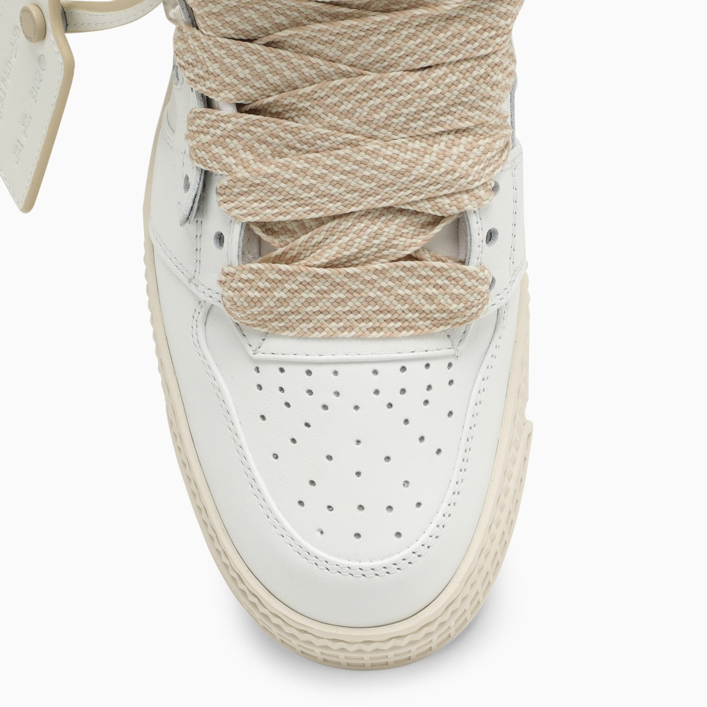 White leather high-top trainer from Off-White featuring a lace-up fastening, a perforated round toe, a black Zip-Tie label and a rubber sole.