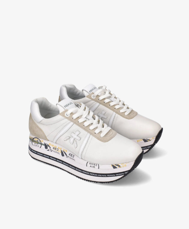 Beth sneakers with upper entirely in white fine leather and slightly contrasting suede details. Platform sole personalized with Premiata logo screen printing.