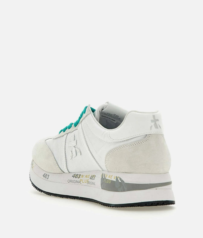 Suede sneakers, white and ice color, nylon inserts, Premiata logo on the tongue and back, contrasting green cotton laces, 4 cm high platform rubber sole with logo