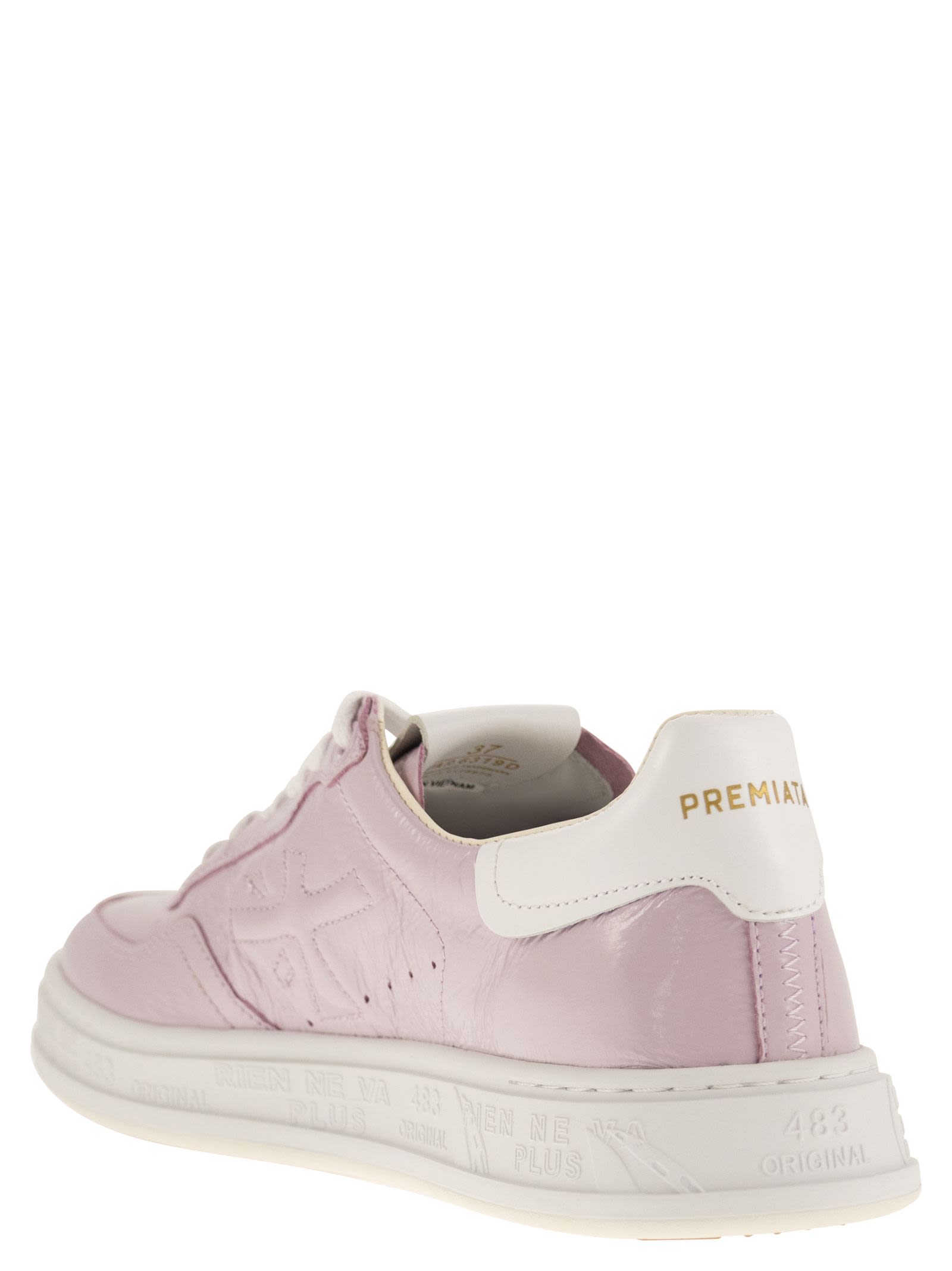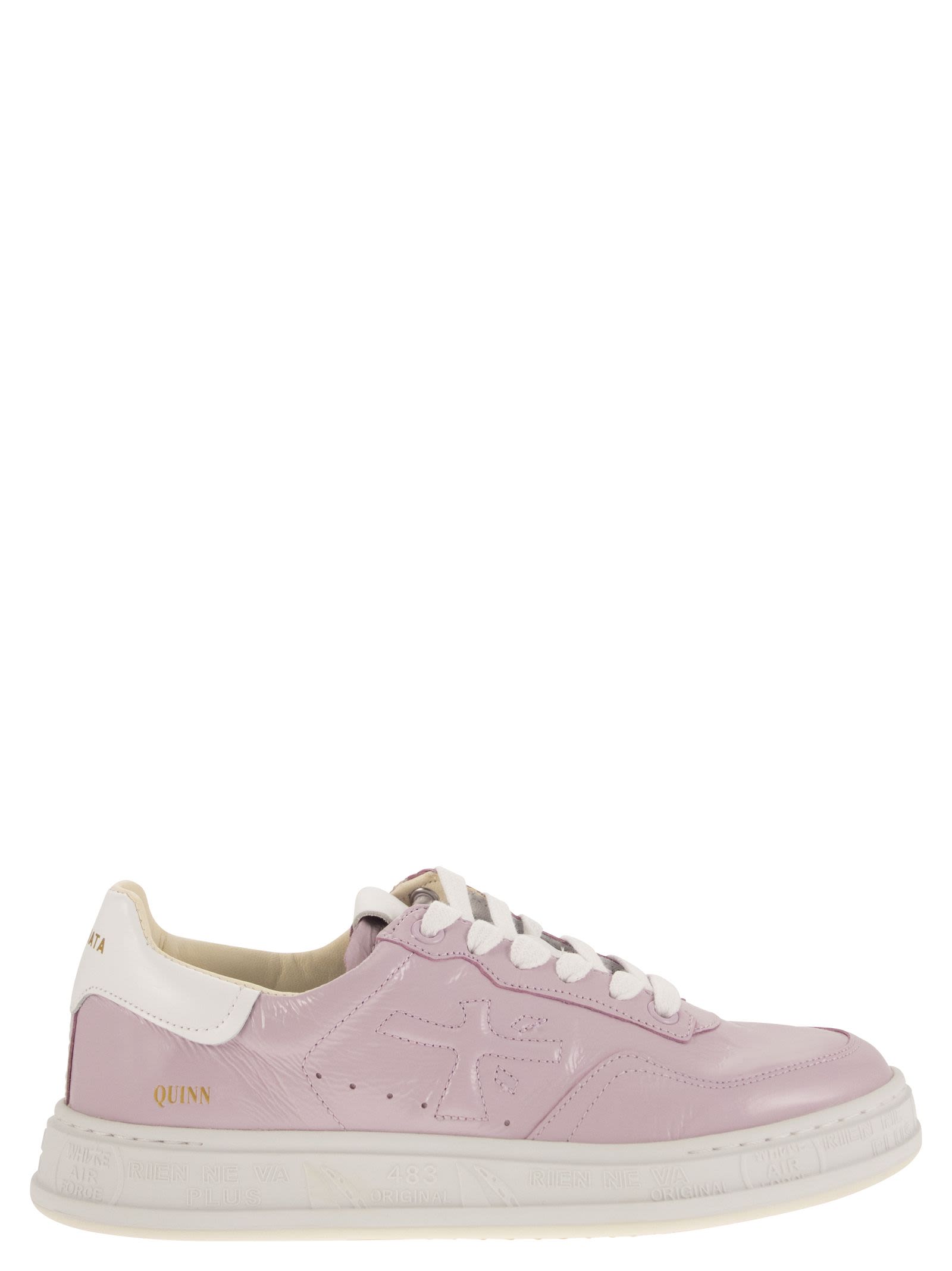The Premiata Quinnd is a leather trainer characterised by a box bottom and a retro 70s look. Made entirely of shiny leather with holes and stitching. The lightweight EVA rubber sole is white and has the brand's signature lettering embossed on it. The insole is leather, ergonomic and removable. - Heel height 3 cm - QUINN lettering on the side DESIGNER ID: QUINND 6319