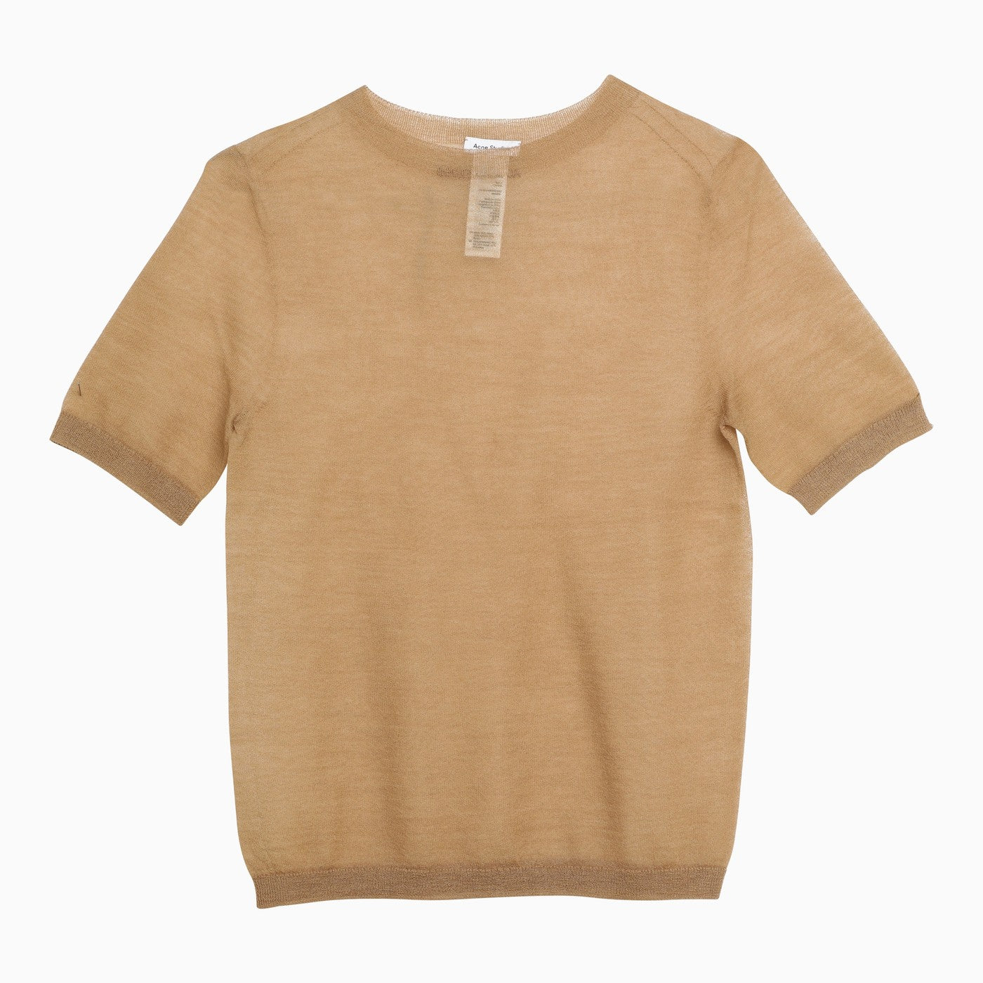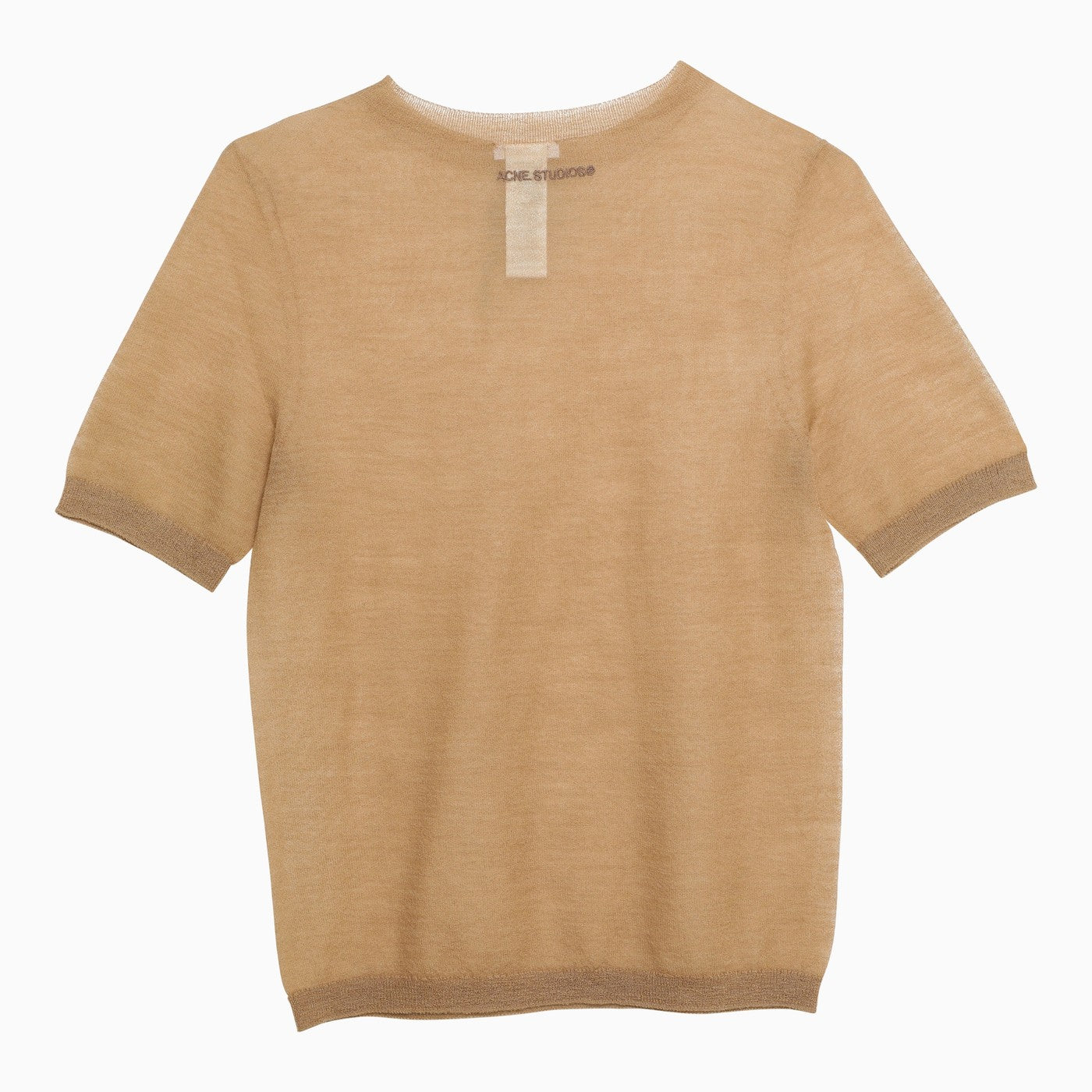 Beige wool-blend crew-neck sweater from Acne Studios featuring short sleeves, a semi-sheer design, a slim fit, ribbed edges and an embroidered logo on the back.