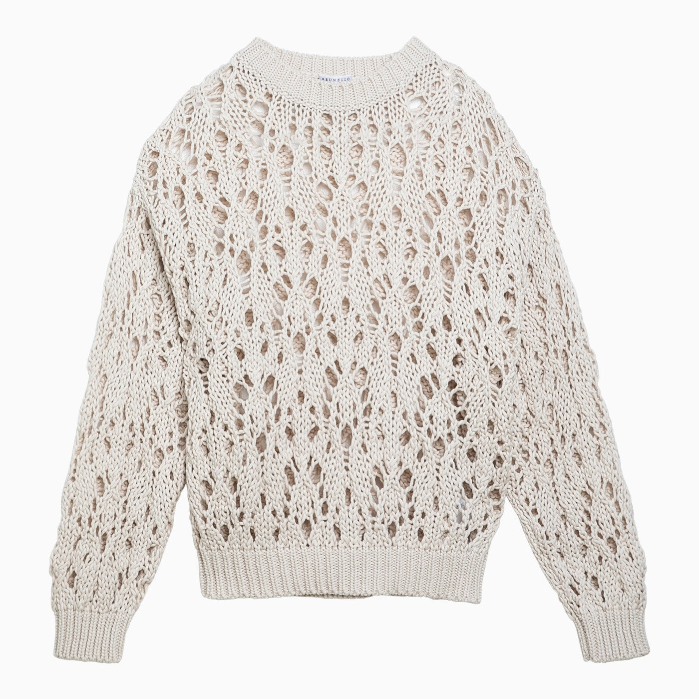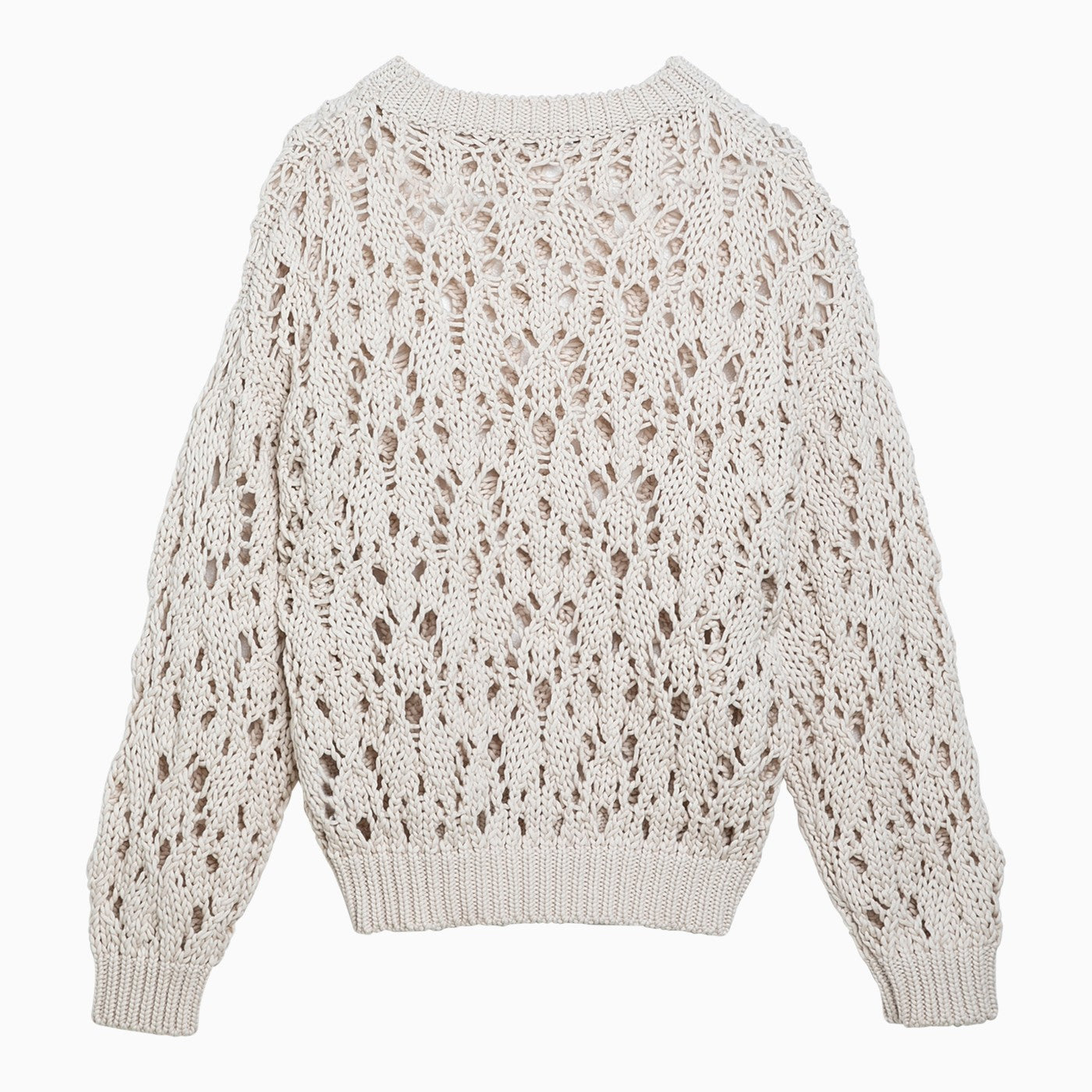 Beige-white cotton crew-neck sweater by Brunello Cucinelli, features a perforated design, long sleeves and ribbed hems.