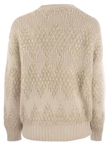 Geometric inspiration enriches the contemporary taste of the wool, cashmere and silk knit. The workmanship of the precious yarn, with its slightly voluminous yet light appearance, combines natural fibres with a yarn endowed with small tone-on-tone sequins, to embellish the texture with a shiny, three-dimensional effect. - Round neck - Dropped shoulders - Ribbed trim DESIGNER ID: M6D368500 CTD79