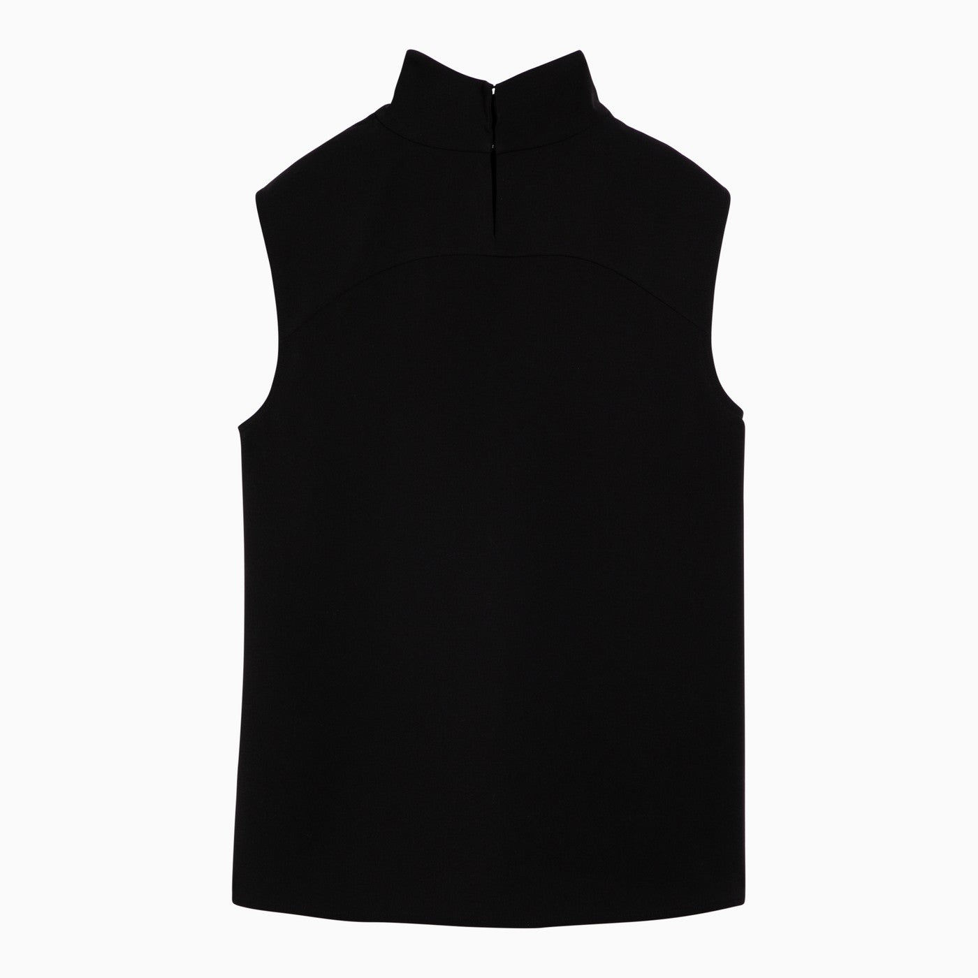 Black Calvin Klein sleeveless turtleneck top featuring a back fastening and metal logo plaque on the front.