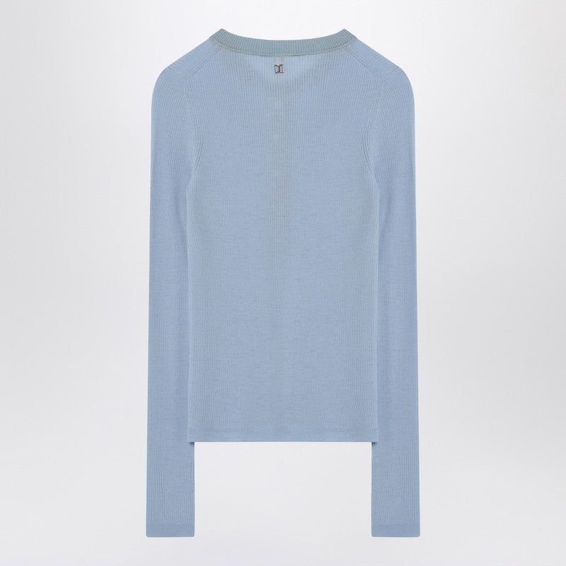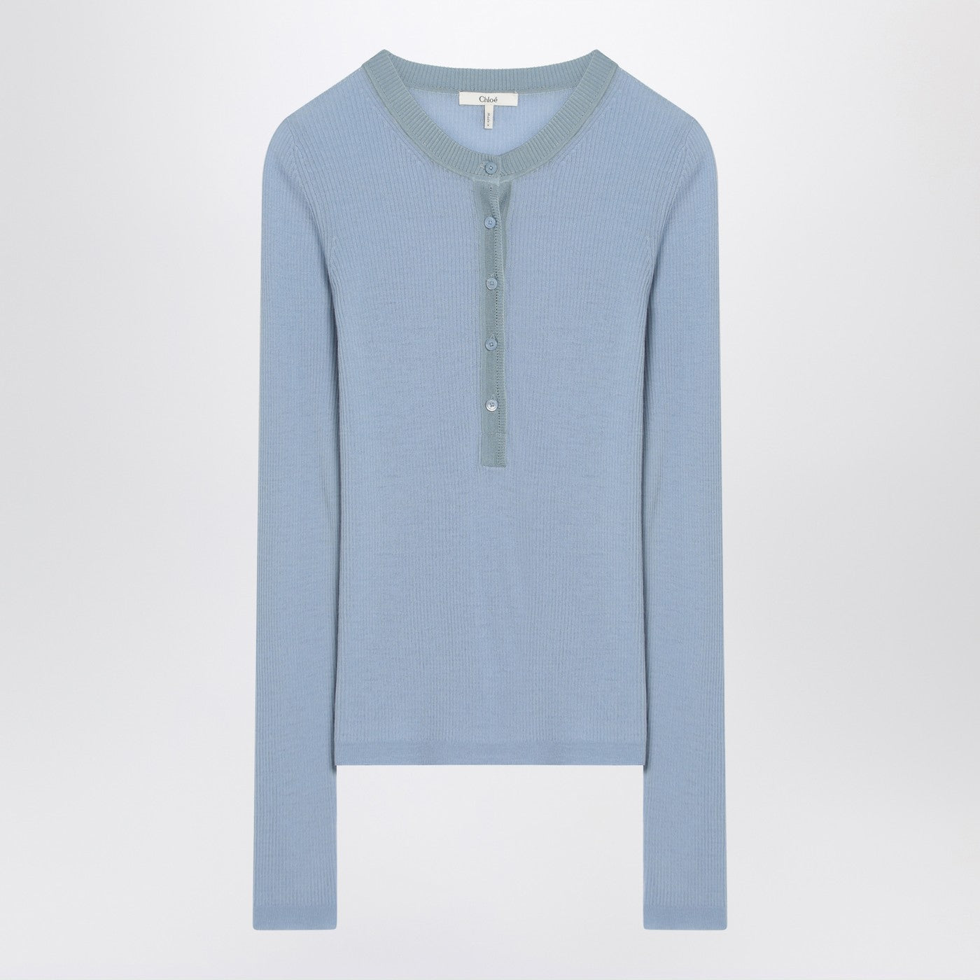 Chloé's blue wool crew neck sweater, featuring ribbed design, long sleeves, buttons on the front, and a logo patch on the chest.