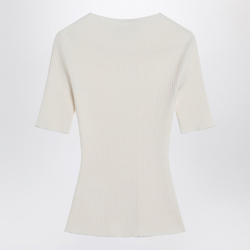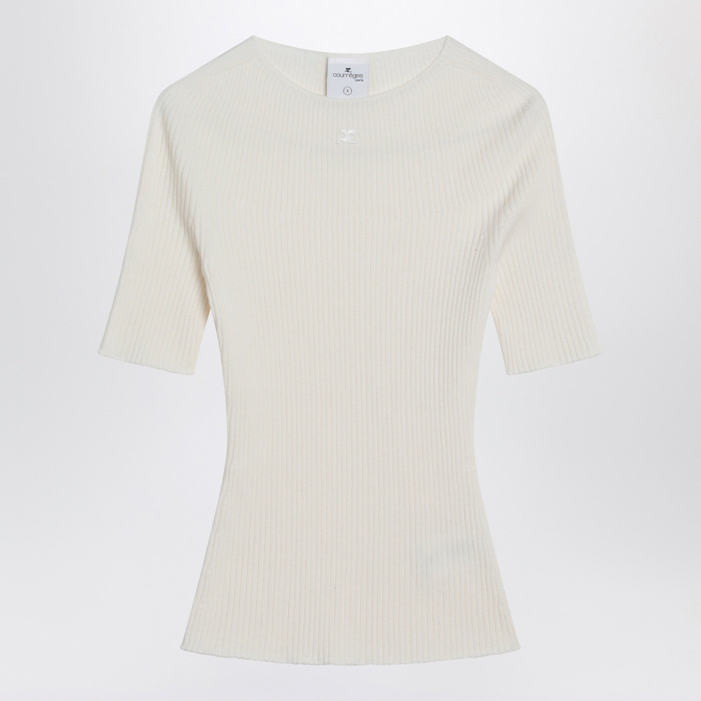 White cotton and wool crew neck sweater by Courrèges, featuring short sleeves, ribbed design, and a small tone-on-tone logo patch on the front.