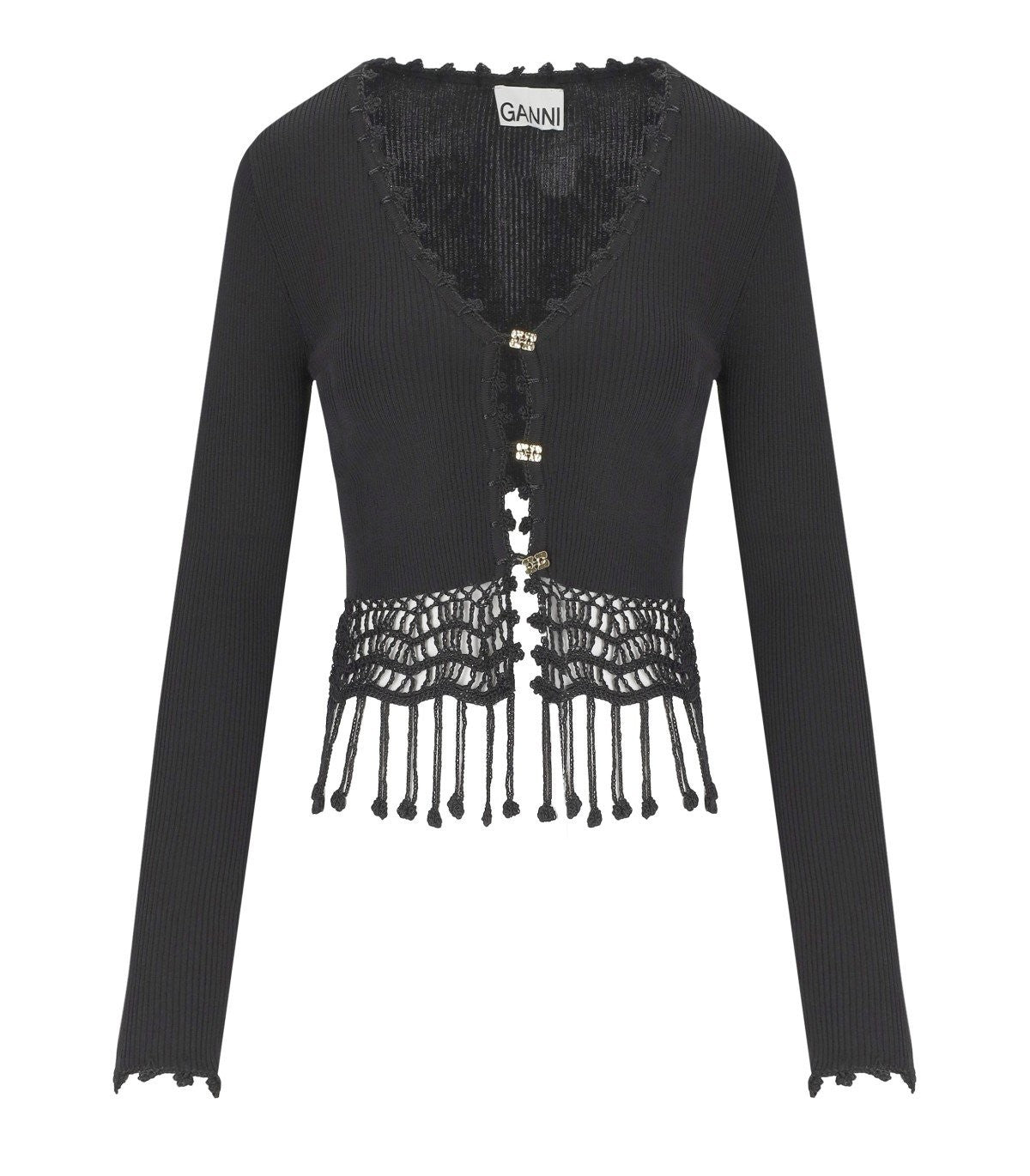 Cropped cardigan by Ganni made of glossy viscose in black. Characterized by a front closure with butterfly-shaped logo buttons in gold metal, it features a deep V-neck and long sleeves. Finished with a romantic detail of fringed crochet work at the hem of the garment. Adorned with an embroidered Ganni logo on the front. Fitted silhouette. Composition: 100% viscose.