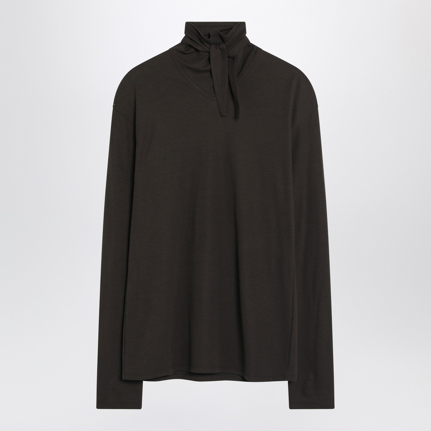 Brown espresso cotton turtleneck sweater by Lemaire, featuring an integrated scarf at the neck, long sleeves, and a straight hem.