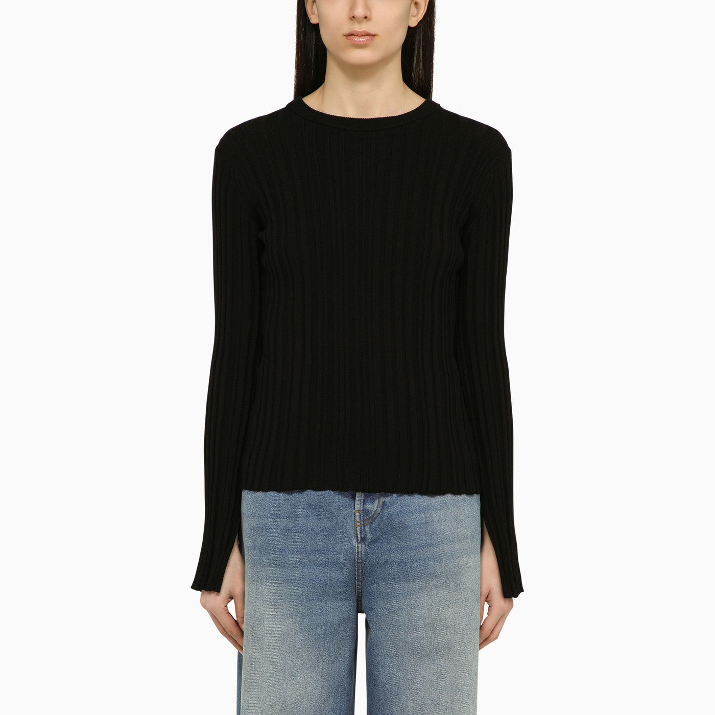 Black silk-cotton blend crew-neck sweater from Loulou Studio featuring ribbed knit, long sleeves and wide slits on the sleeve.