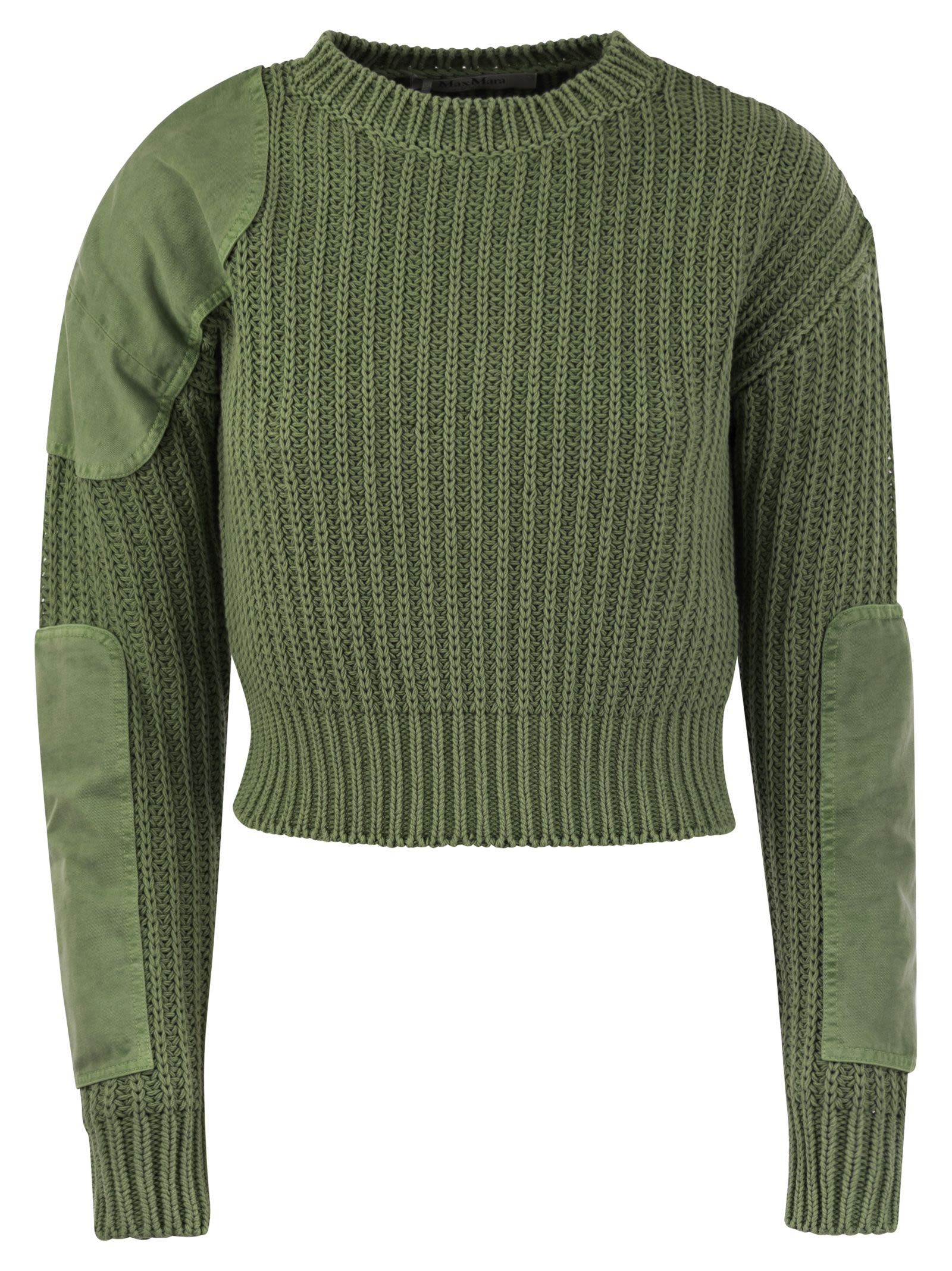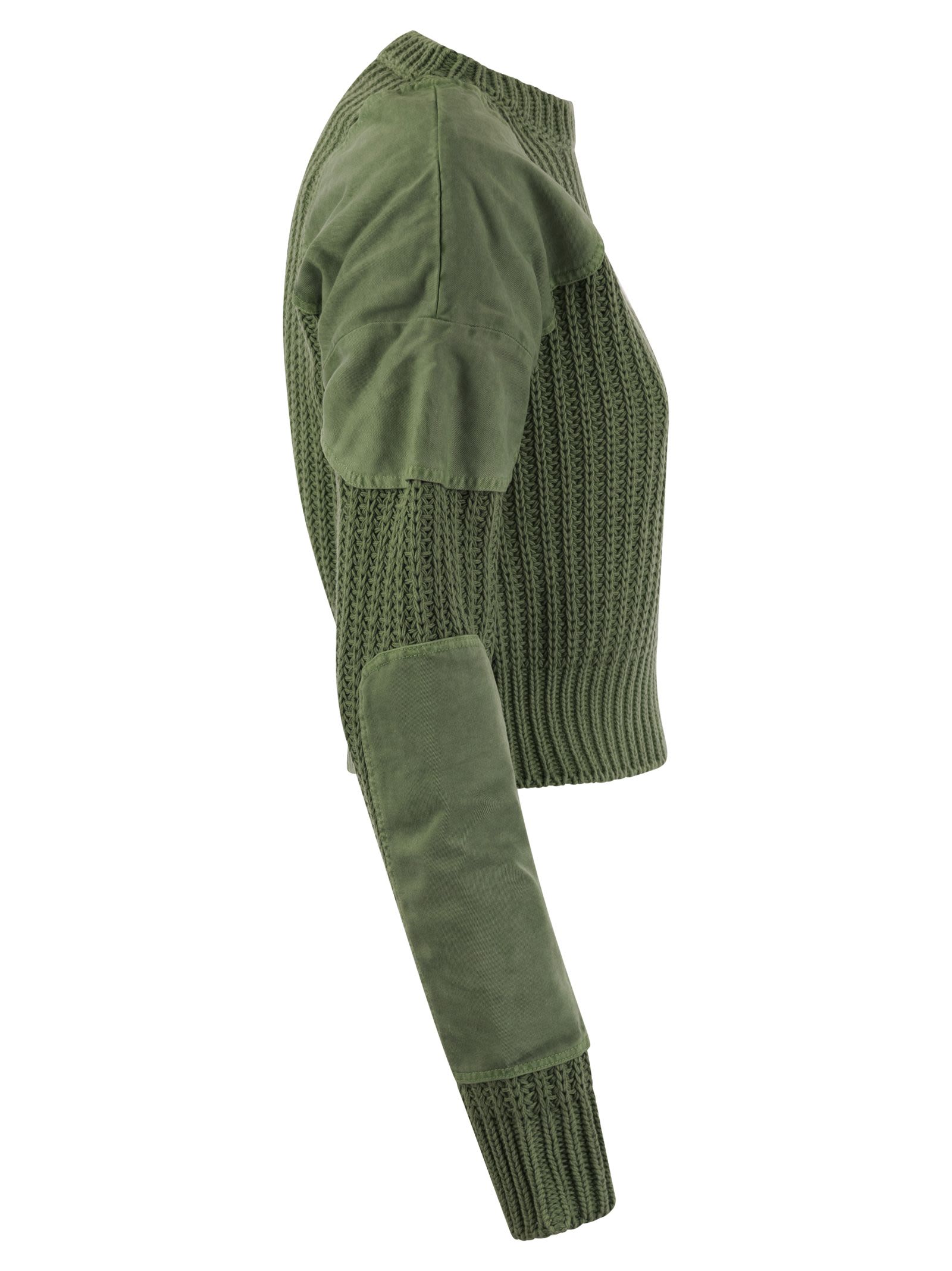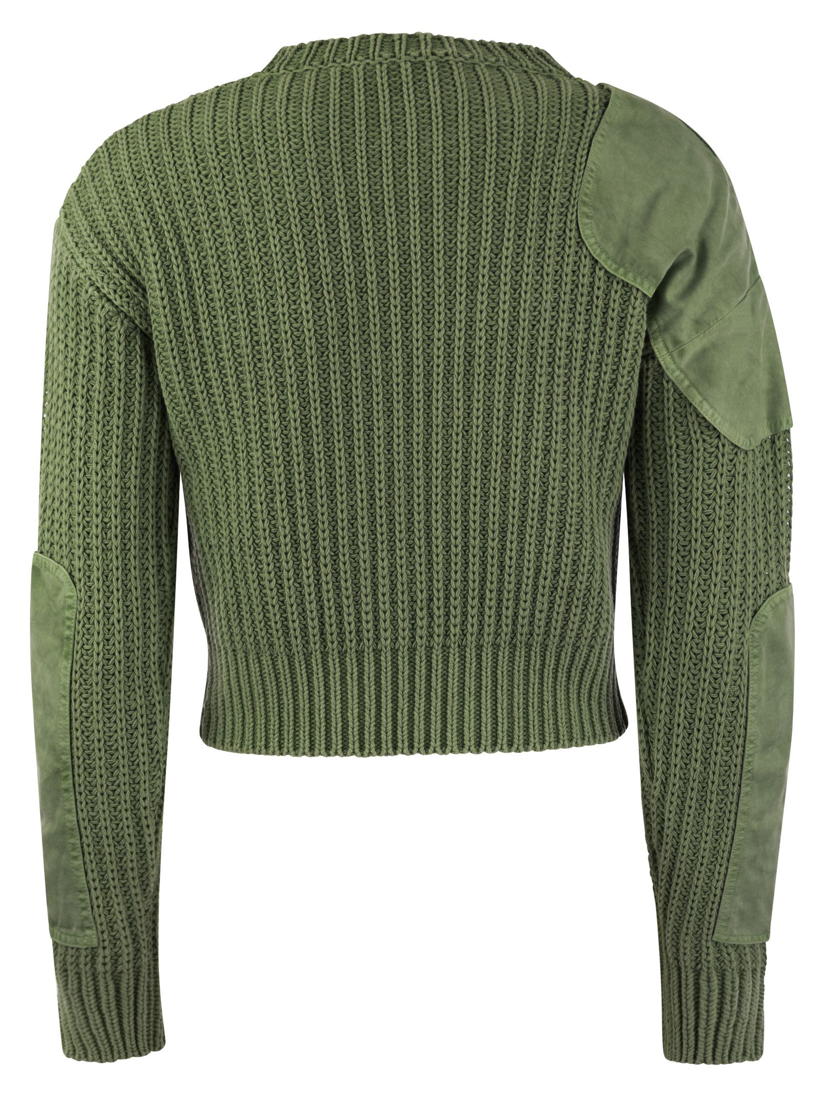Cropped pullover made of pure, garment-dyed cotton cordonet, worked in English rib knit. The model features matching cotton canvas patches on the sleeves and right shoulder. Crew-neck model with long, low-cut sleeves, finished with ribbed trim - Crew neck - Tone-on-tone patches - ribbed workmanship DESIGNER ID: 2411361233600 011