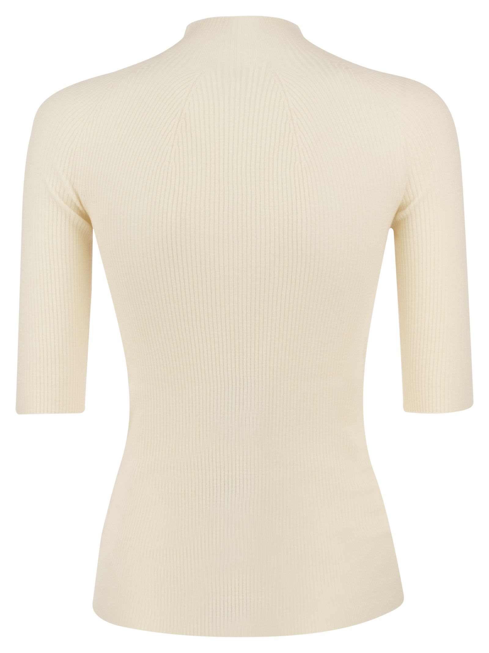 Wool tricot sweater with elbow sleeves and high collar. Perfect to use on its own or as an under-jacket, thanks to its snug fit. - Ribbed knit - Round neckline - Elbow sleeves - Ribbed cuffs, collar and hem finishes - Dry fit DESIGNER ID: S99681F18 09770 440