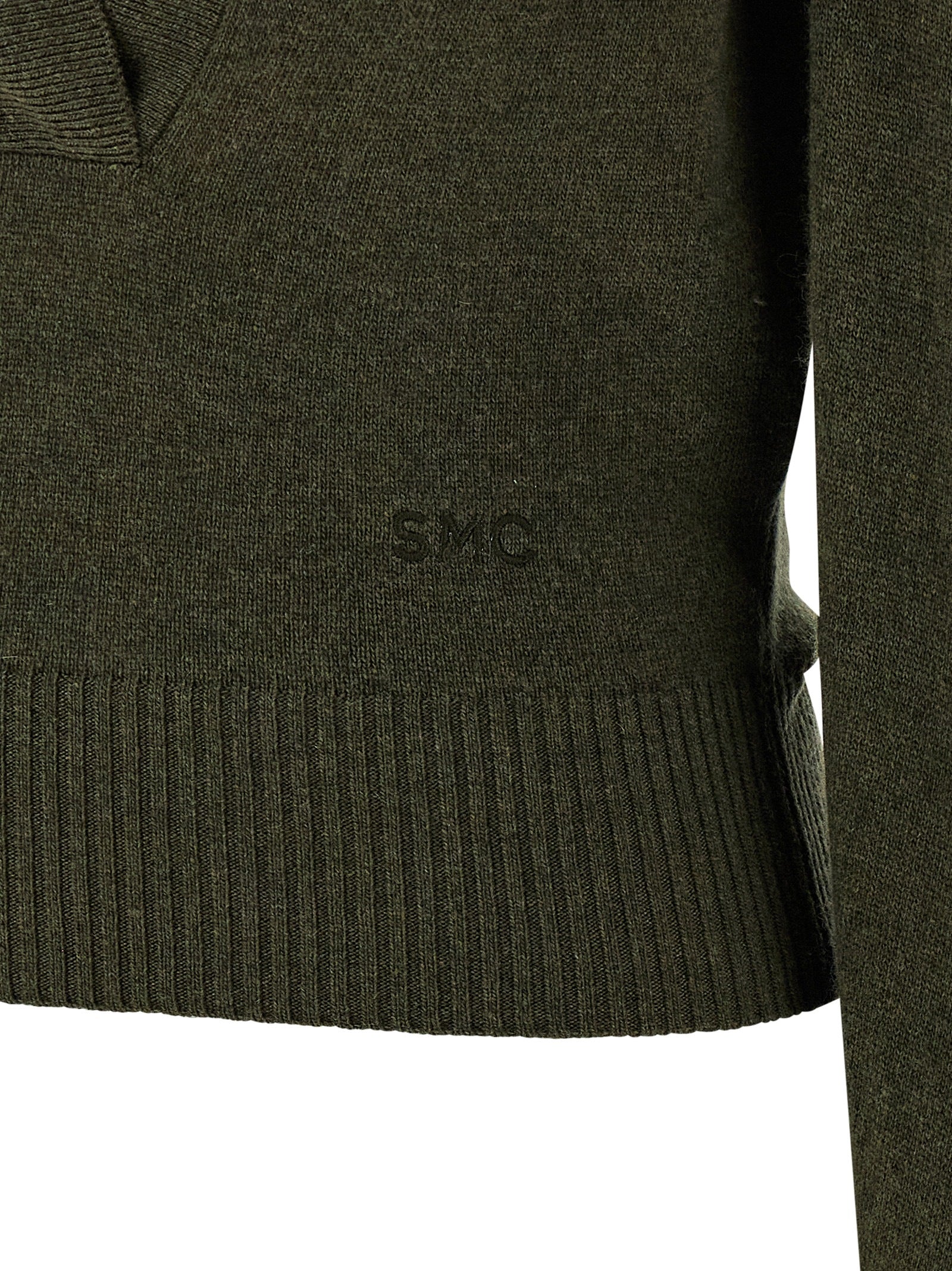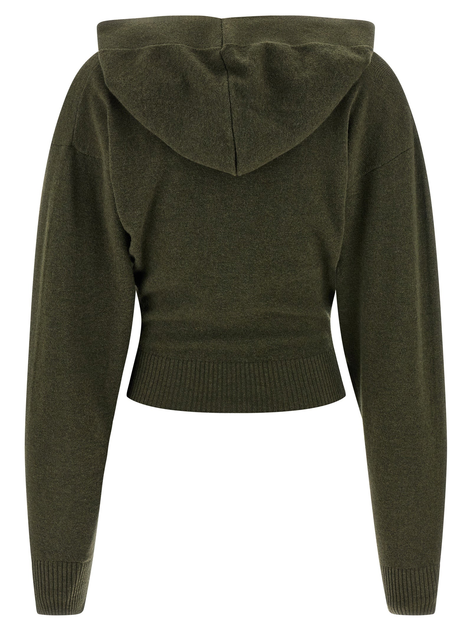 Virgin wool hooded sweater with slightly cropped style, tone-on-tone embroidered logo on the front, wide V-neck, long sleeves with cuffs and dropped shoulders.