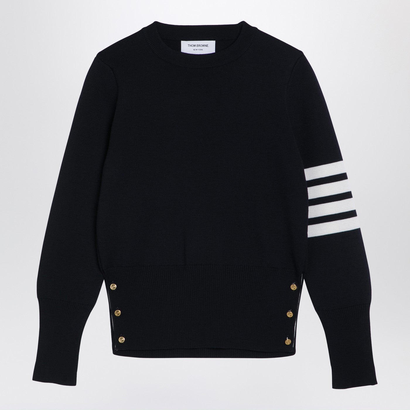 This navy blue virgin wool crew-neck sweater from Thom Browne features long sleeves with contrasting white stripe detail and gold button cuffs, stitched logo patch on the front, ribbed hems, side slit with gold buttons and tricolour back detail.