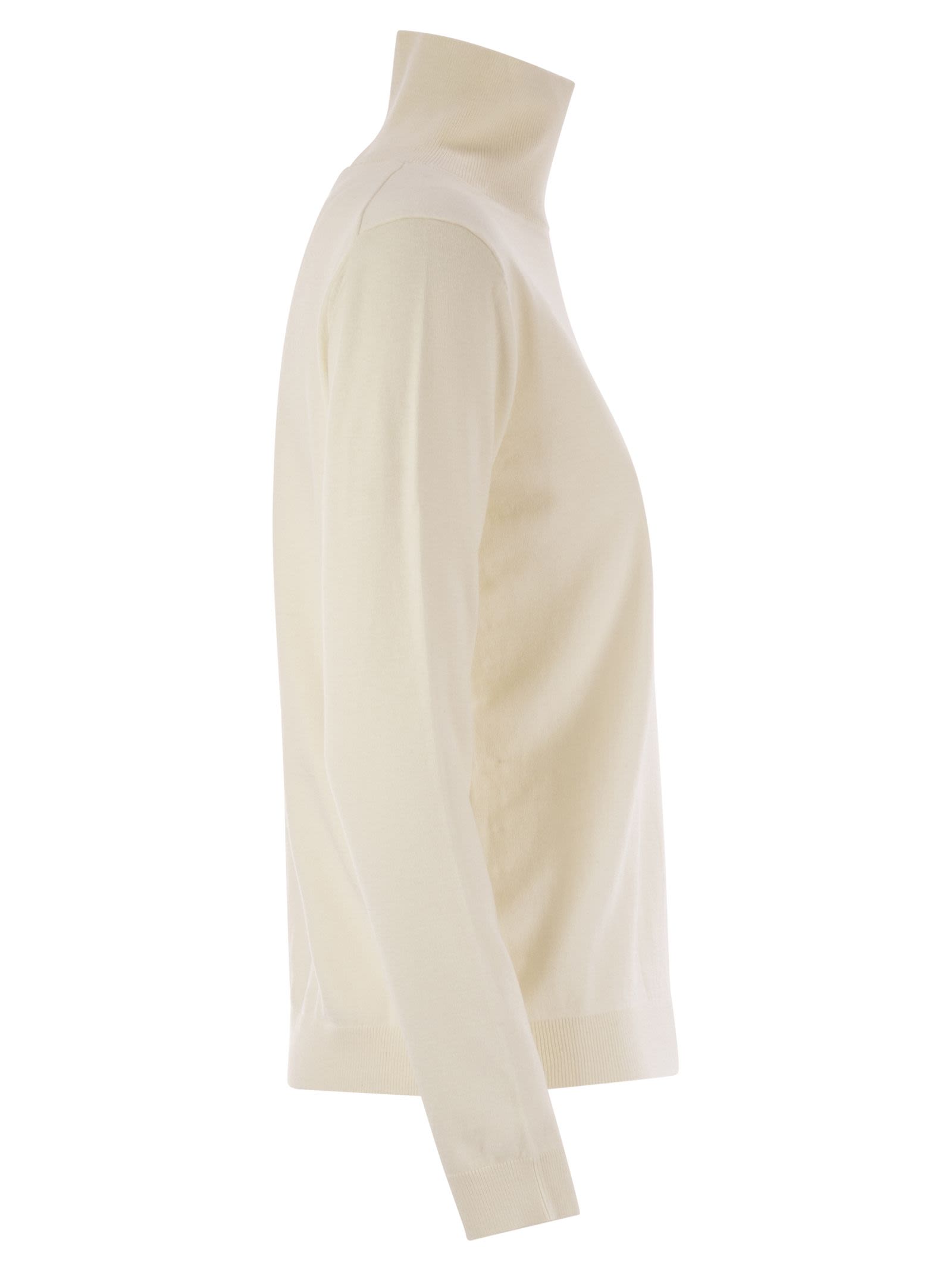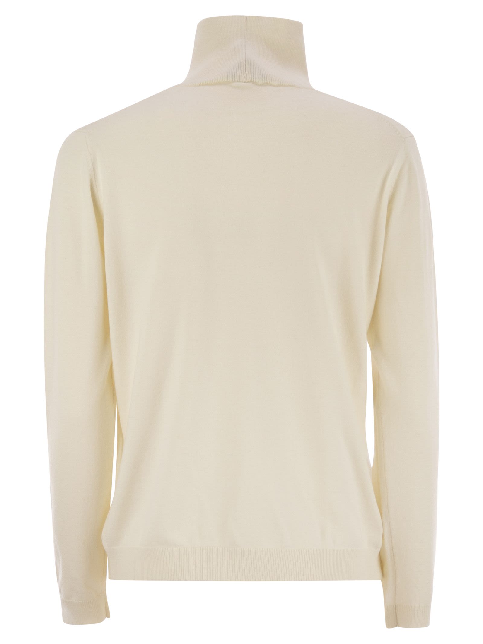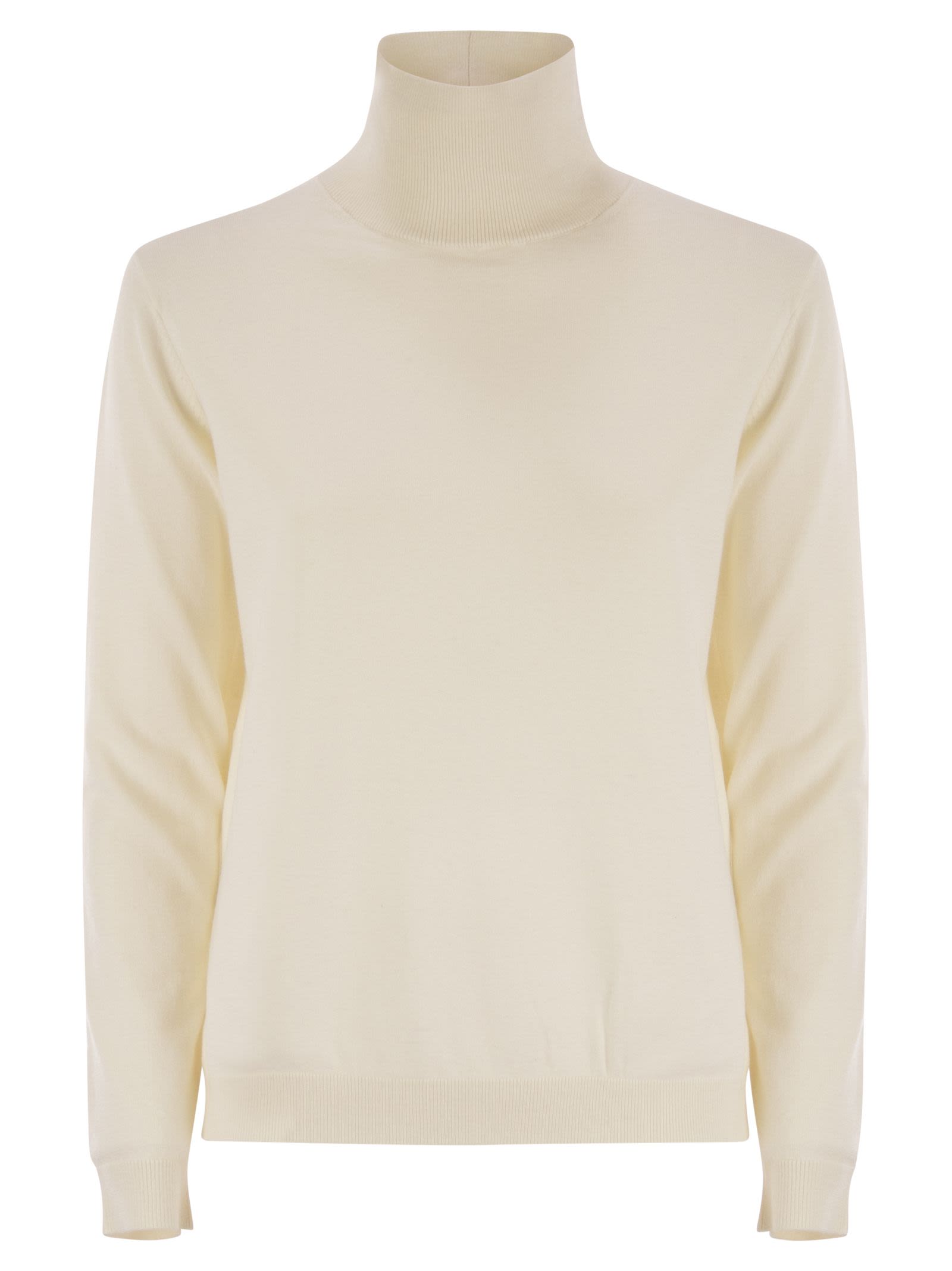 Turtleneck sweater in silk and wool yarn knitted in satin stitch. - Turtleneck - Soft line - High collar - Long round sleeves - Ribbed finished edges DESIGNER ID: 2525366012600 001