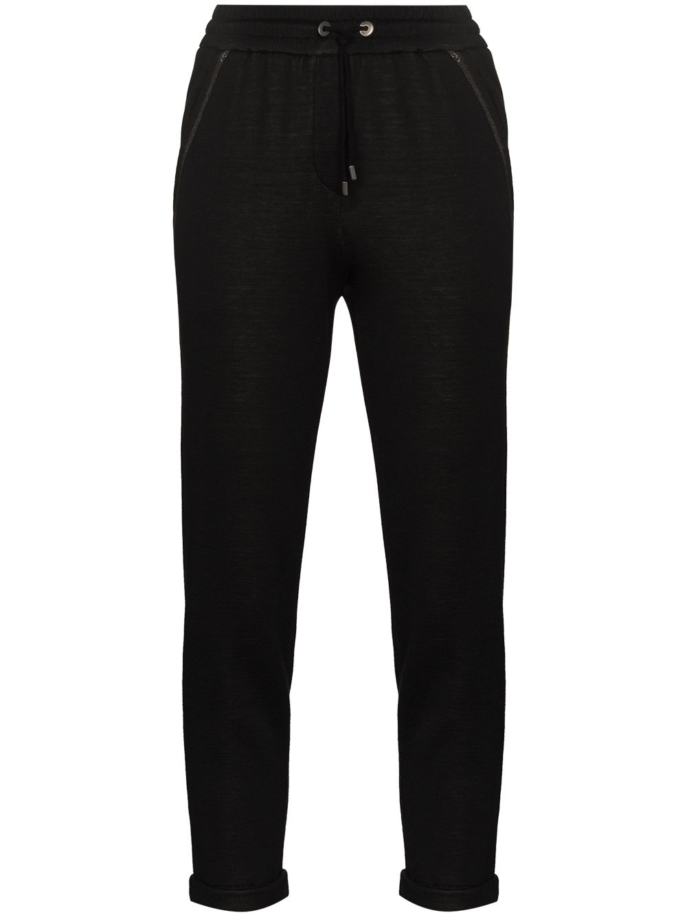 Black cotton/silk blend Monili-detail drawstring track pants from BRUNELLO CUCINELLI featuring signature Monili chain detail, elasticated drawstring waistband, slim cut and two side slash pockets.