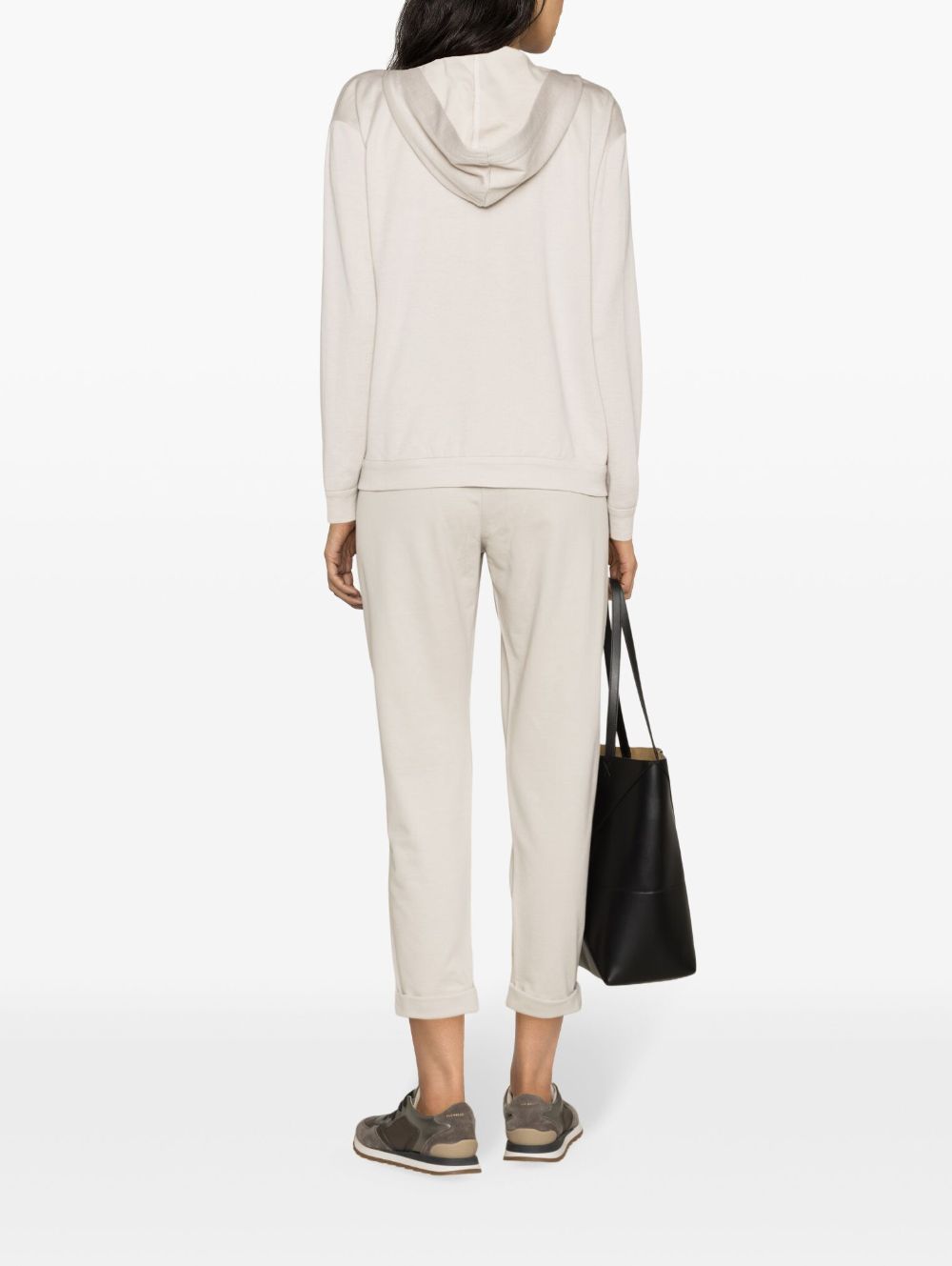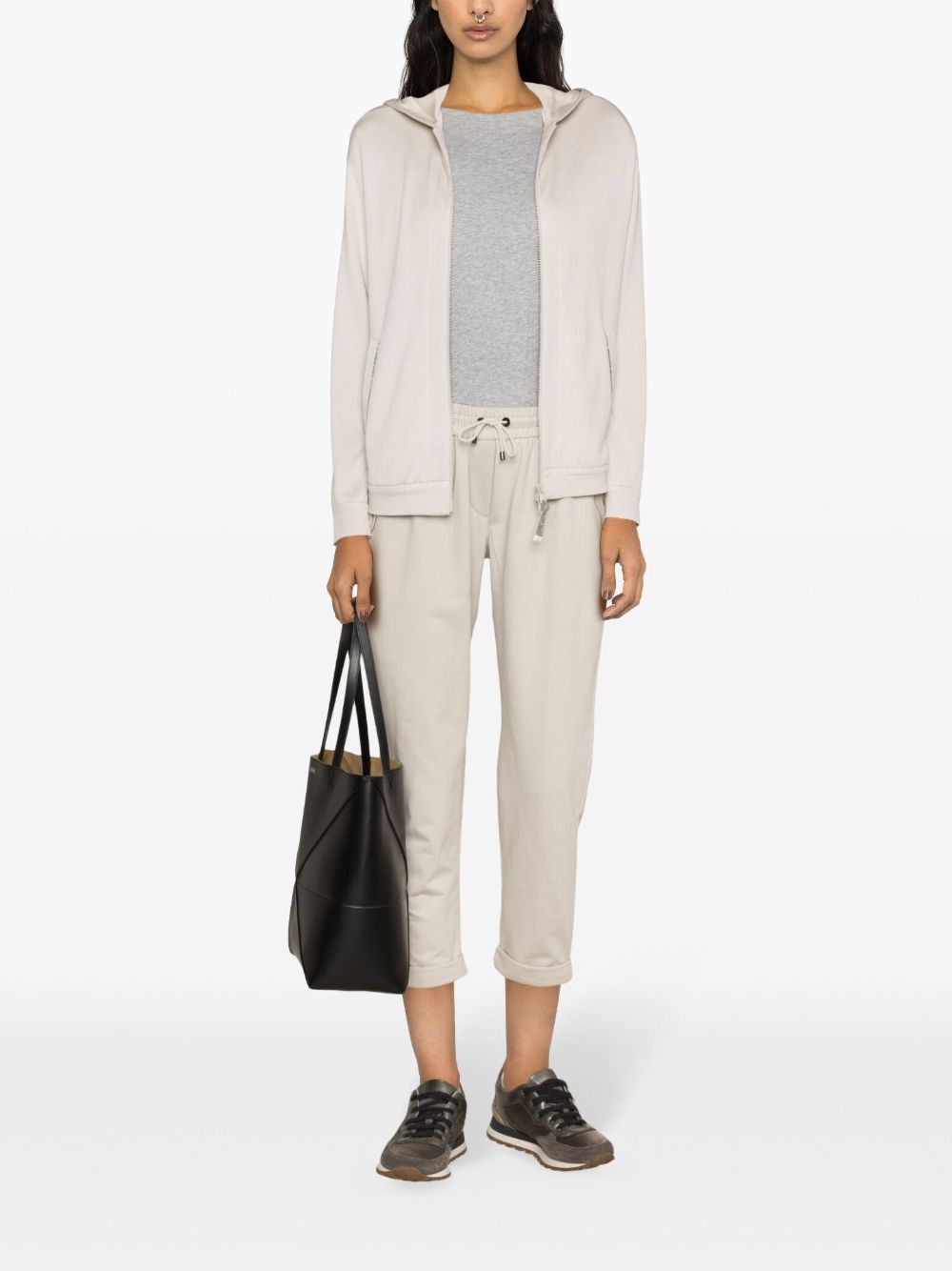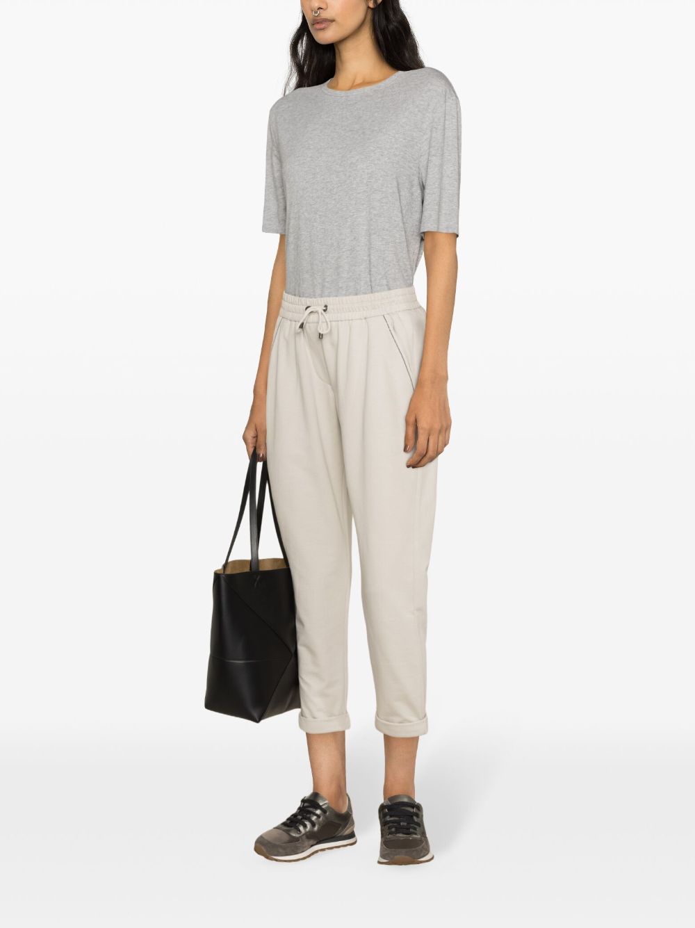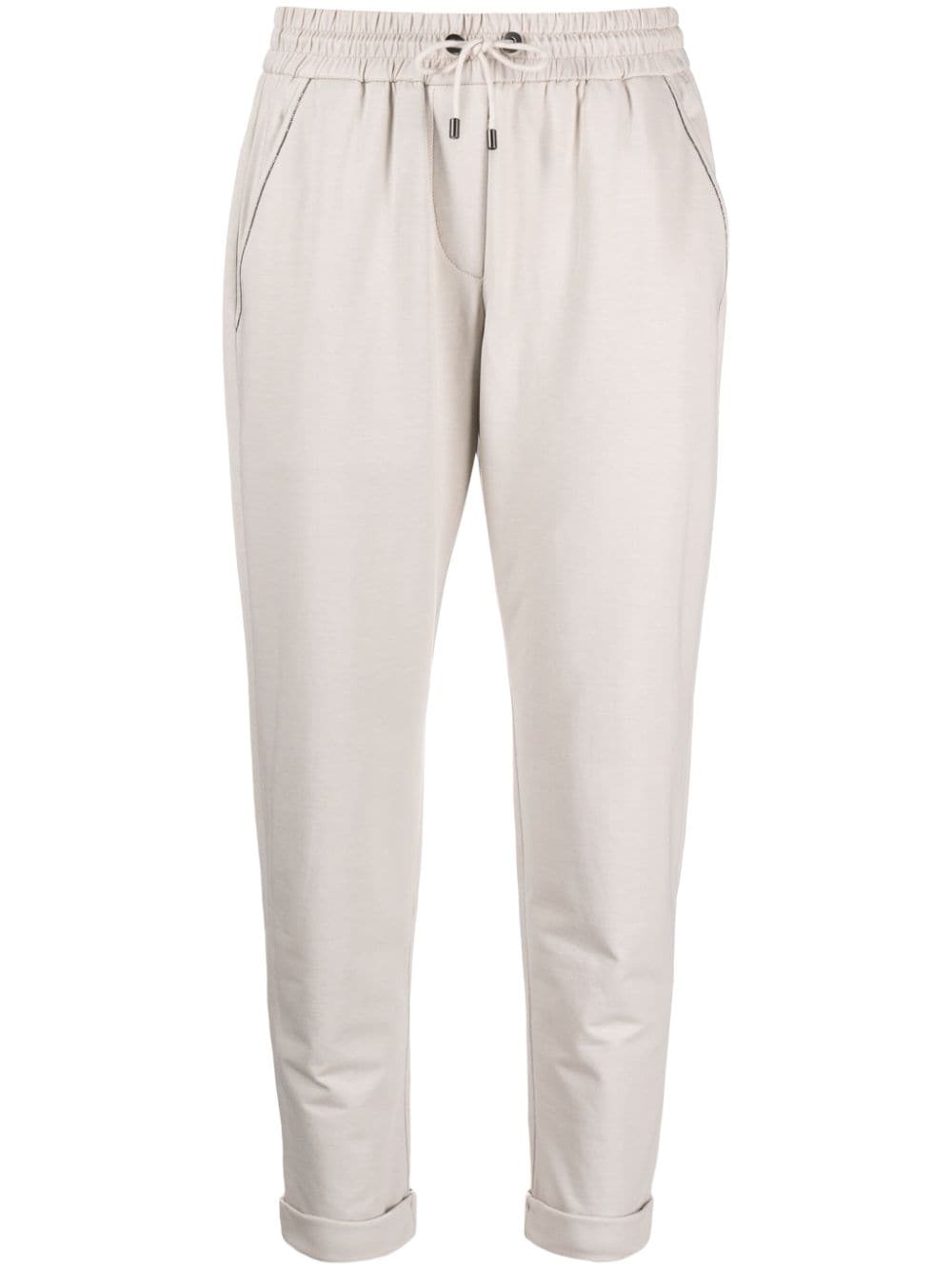 beige stretch-cotton jersey texture bead detailing cropped leg elasticated waistband with internal drawstring two side slit pockets turn-up hem