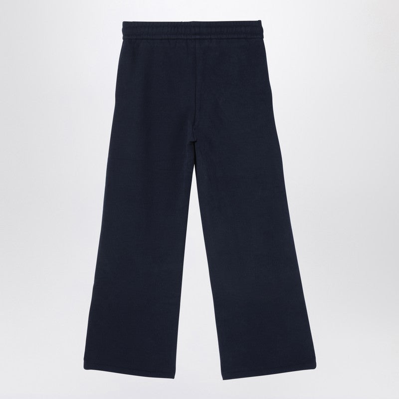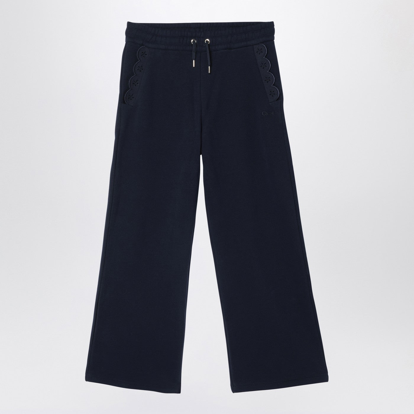 Navy blue cotton Chloé trousers featuring an elasticated waistband with drawstring, two side welt pockets with lace detail and tone-on-tone embroidered lettering logo on the front.