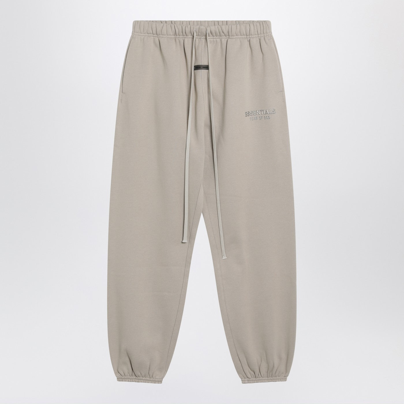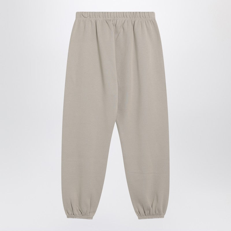 Jogging pants by Fear Of God Essentials in greige cotton blend, featuring an elasticated waistband with drawstring, two side pockets, front logo patch, dropped crotch, elasticated ankle cuffs, and raised front logo lettering embroidery.