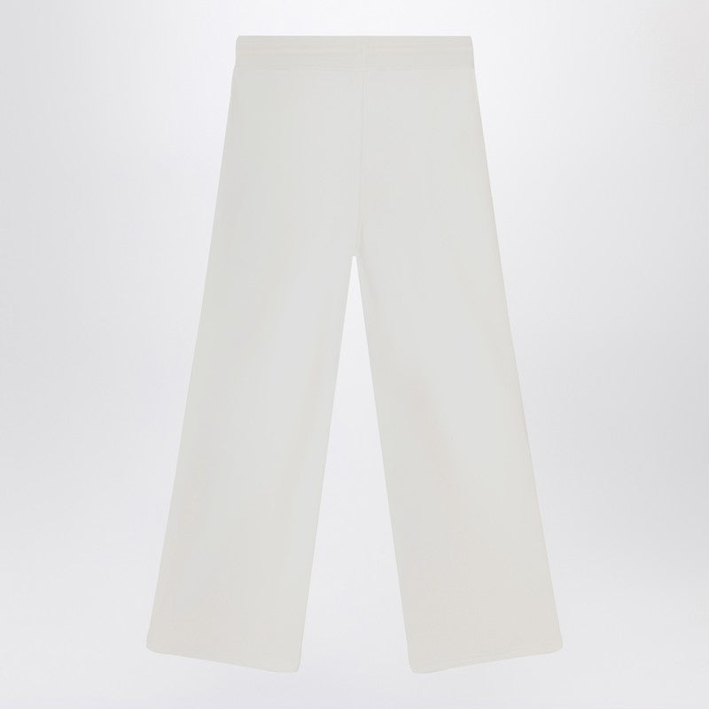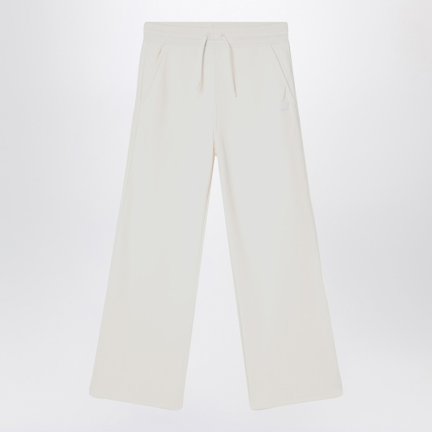 White cotton K-Way sporty flared trousers featuring a ribbed elasticated waistband with drawstring, two side welt pockets and logo patch on the front.