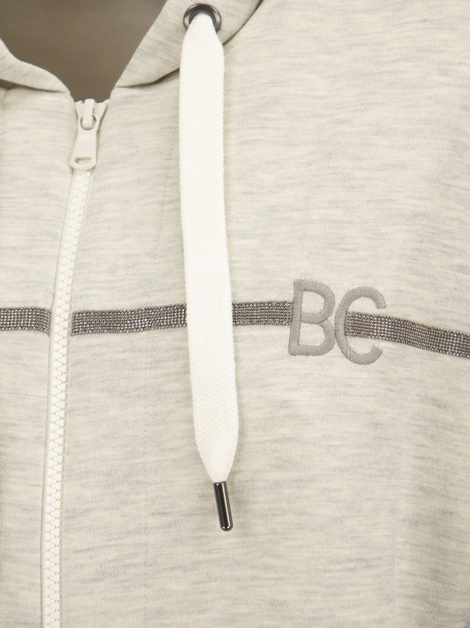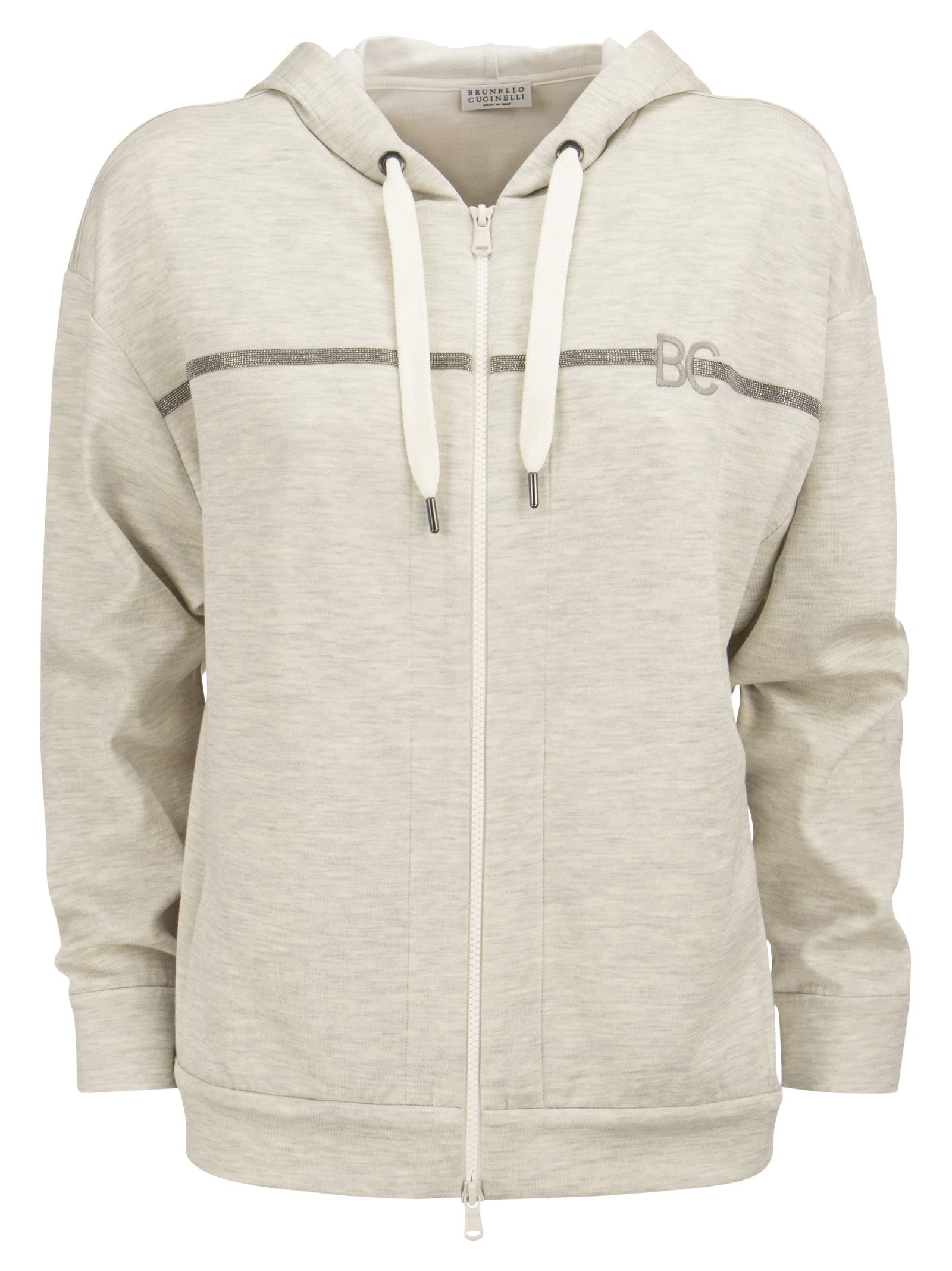 The fine materials of Brunello Cucinelli meet the informal style of the Travelwear line, dedicated to moments of relaxation and leisure. The new topwear in cotton and silk interlock combines sporty taste with refined and precious details. A wide stripe composed of thin rows of shiny jewels crosses the chest horizontally, where the iconic letters BC stand out, interrupting the luminous trail. The adjustable drawstring hood and dropped shoulders define the comfortable fit of the topwear. DESIGNER ID: MD828BN406 C8176