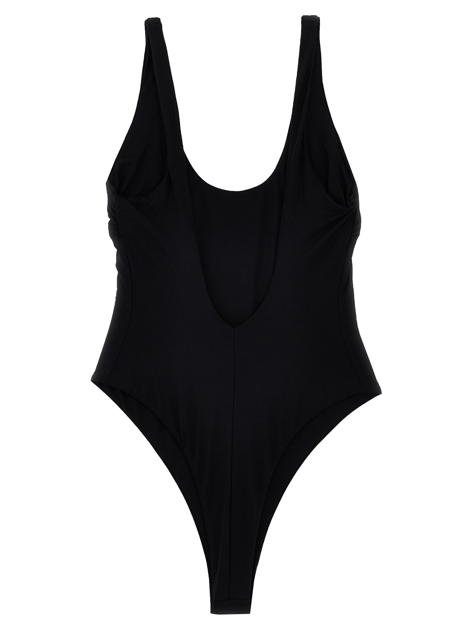 One-piece swimsuit in stretch fabric, tone-on-tone rhinestone logo appliqué, and high-cut design.
