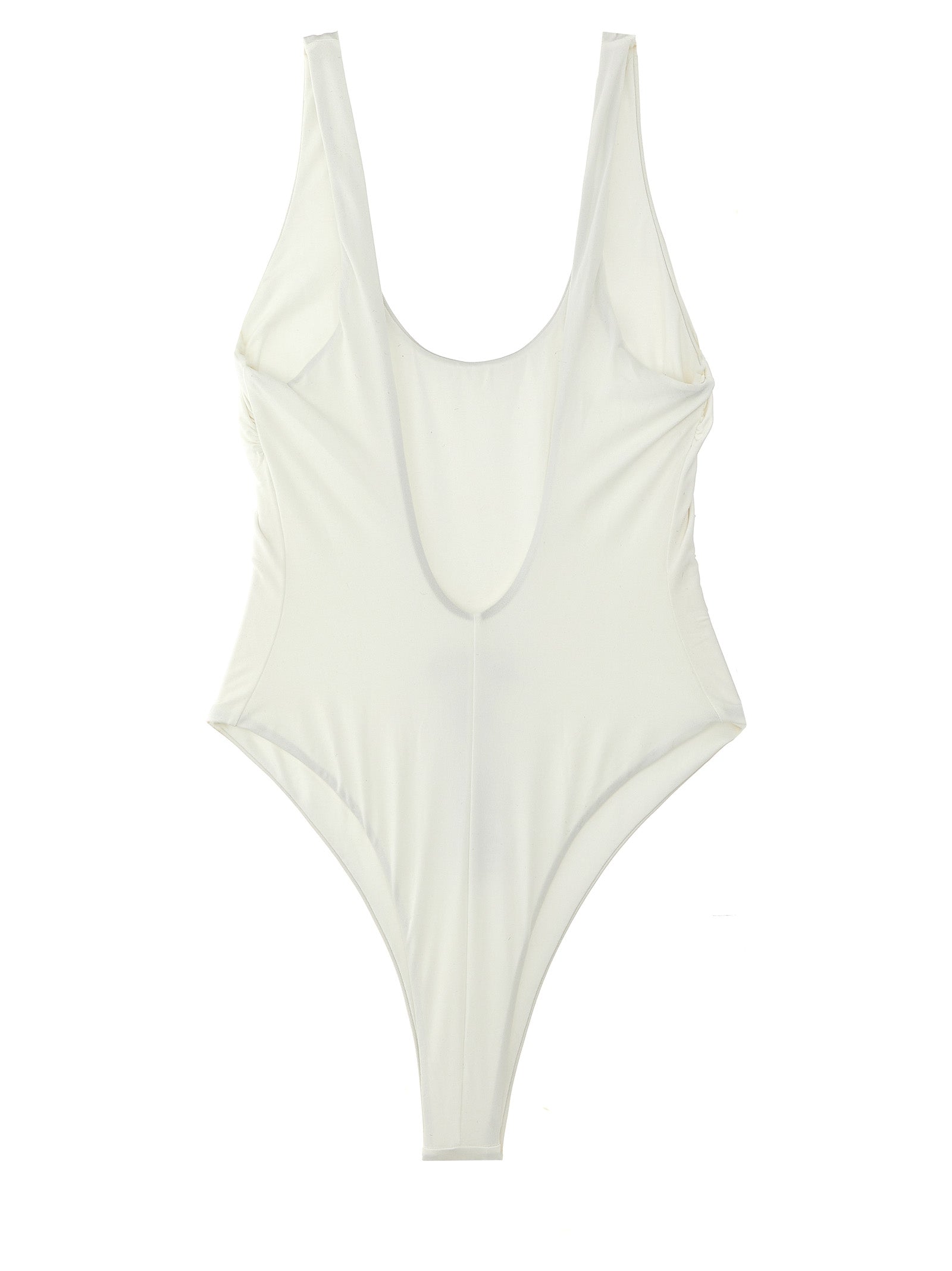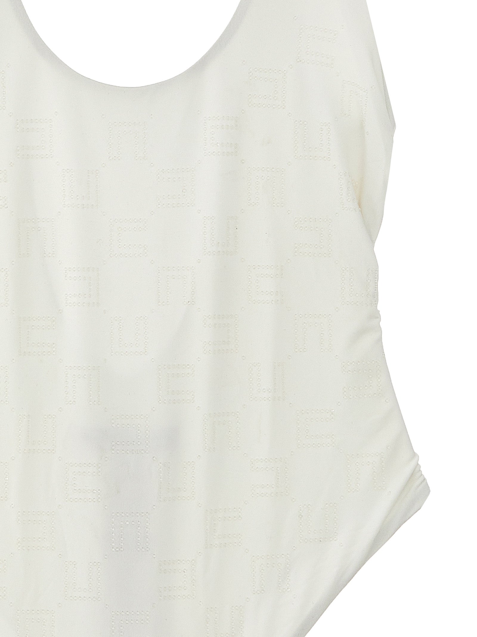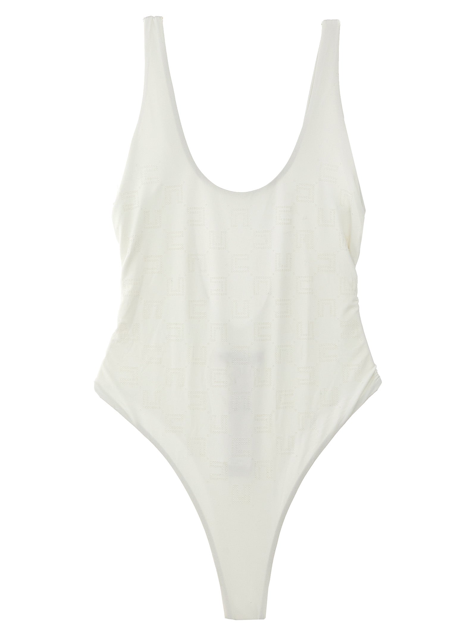 One-piece swimsuit in stretch fabric, tone-on-tone rhinestone logo appliqué, and high-cut design.