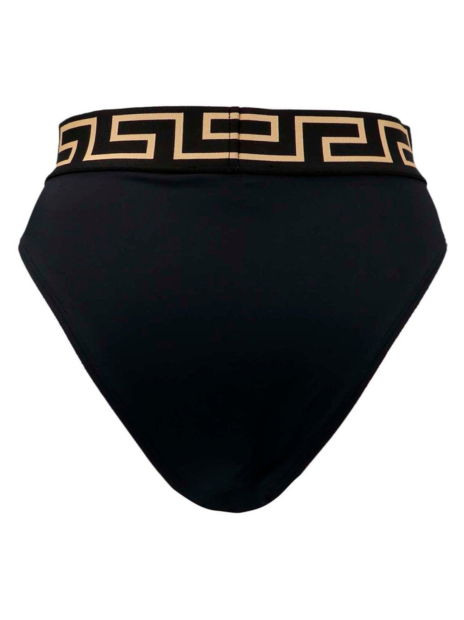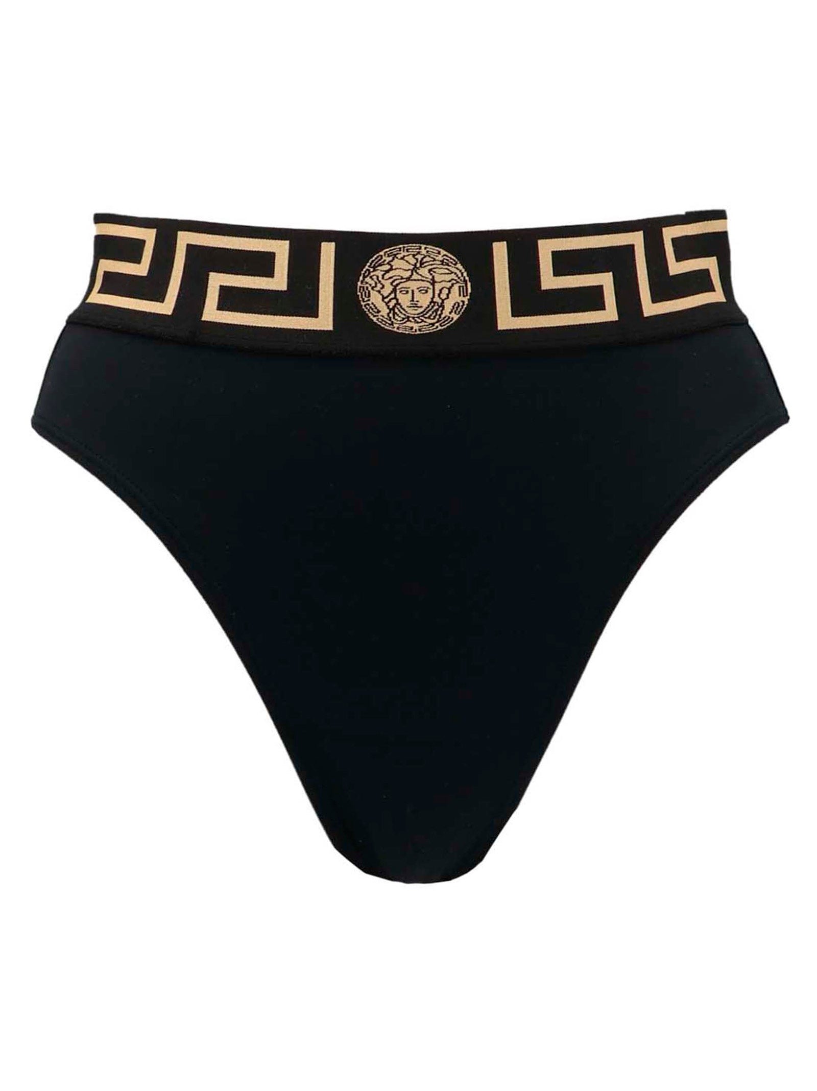 Stretch fabric bikini bottoms with high leg, elastic band with 'Greca and Medusa' pattern.