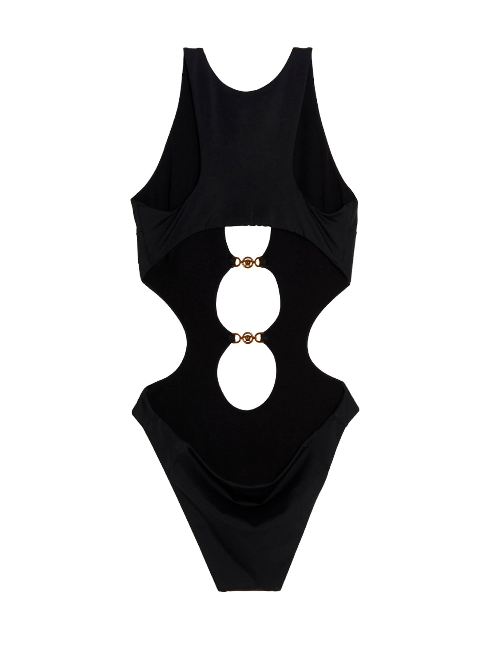 ‘Greca chain' one-piece lycra swimsuit featuring front cut-out detailing embellished with Greca metal detailing.