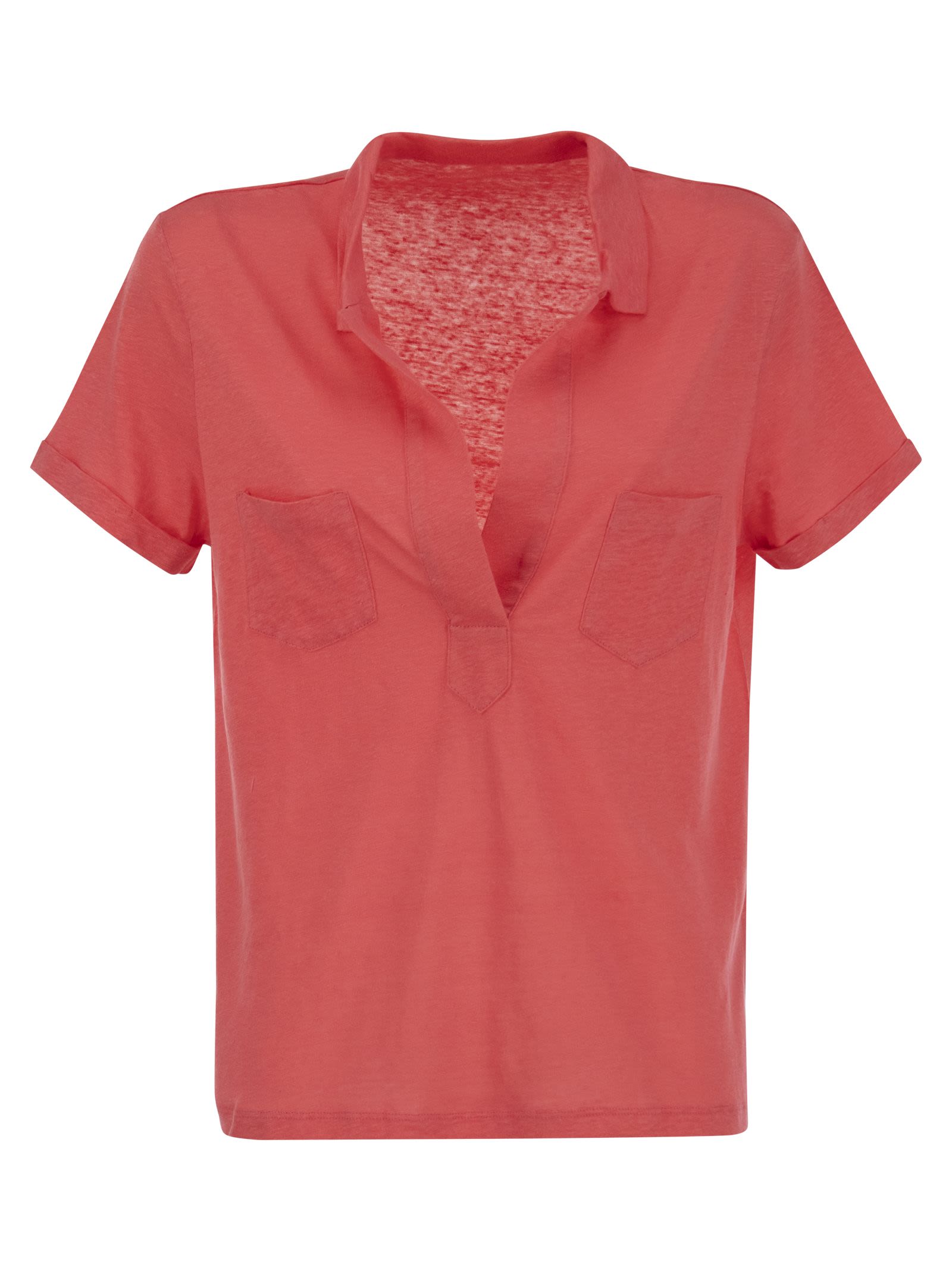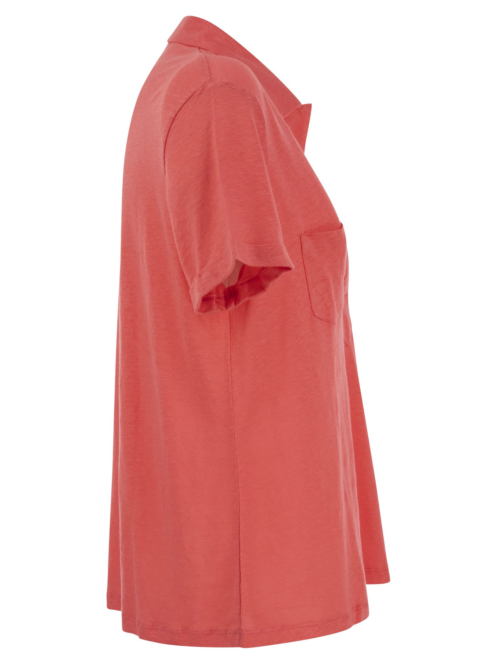 Polo shirt with short sleeves and slim fit, collar and two patch pockets at chest height. The linen and elastane composition makes this polo shirt precious and comfortable, simple and elegant. - Seraphim neckline - Regular fit - Short sleeves DESIGNER ID: E23M011 FPO007 525
