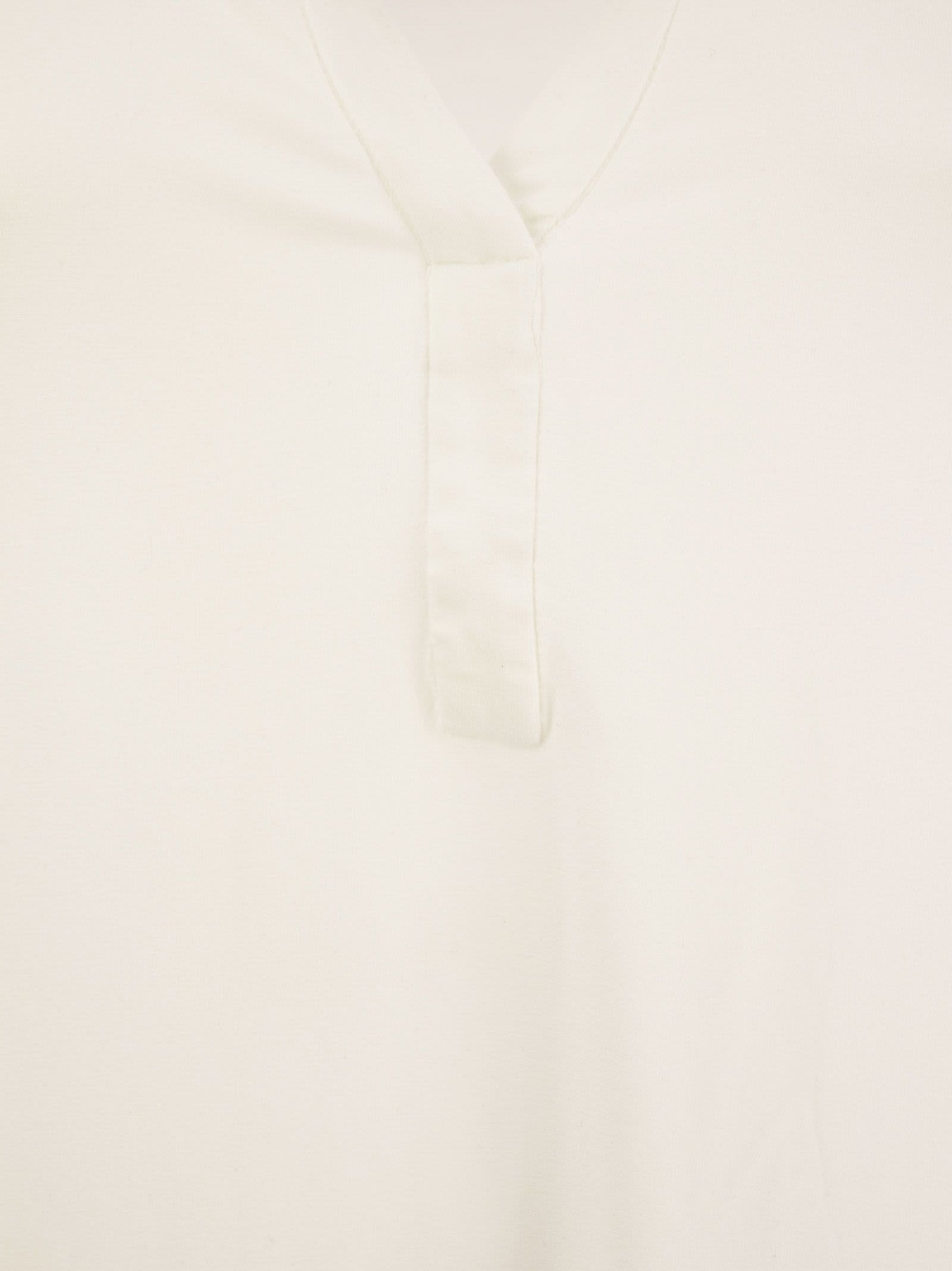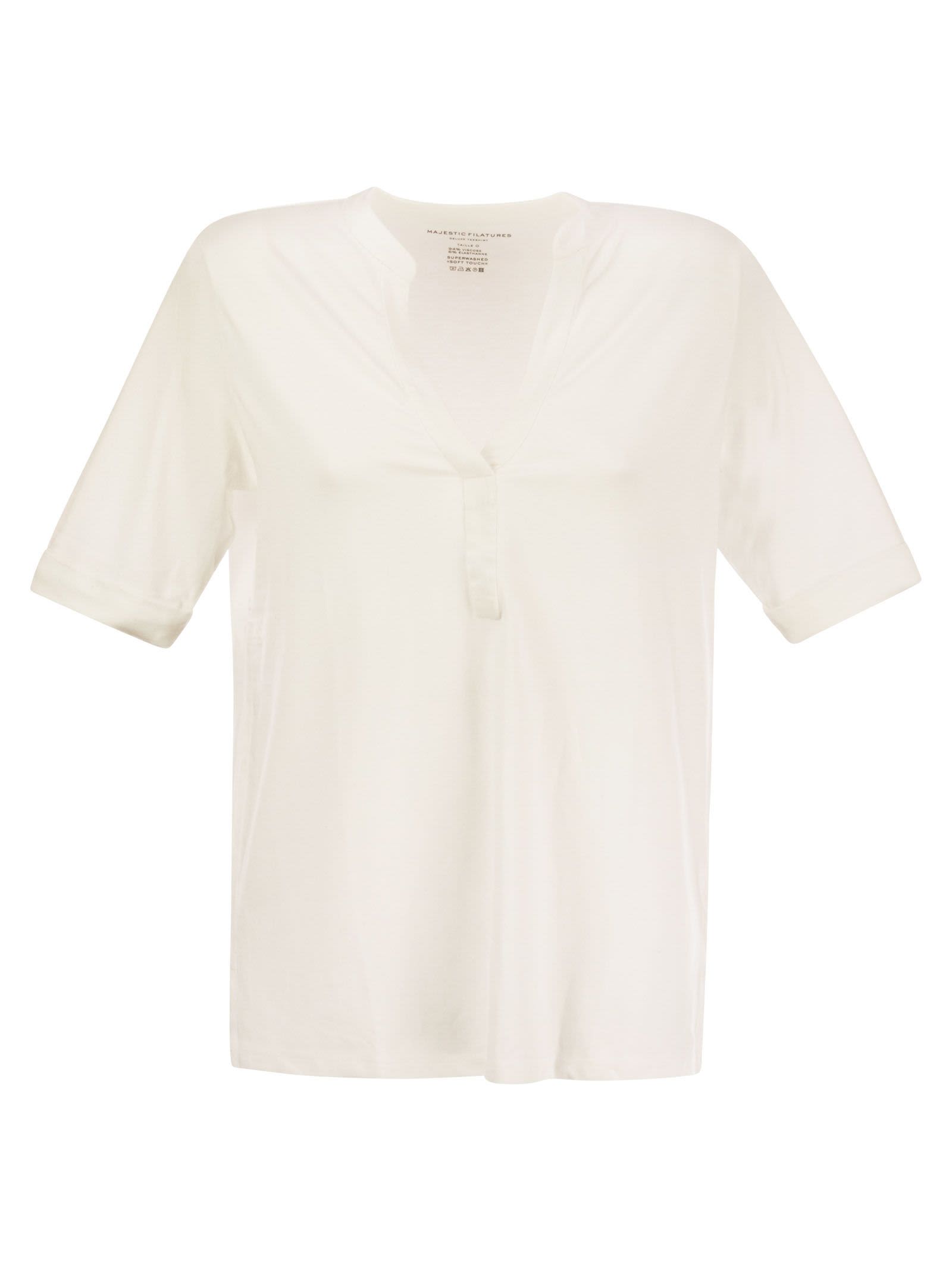 Tunisien with serafino neckline, half sleeves and regular fit: a versatile and feminine garment, simple and elegant. The composition of viscose and elastane enhances its lightness and softness to the touch. The simple shapes and soft lines allow this shirt to be combined with other garments or worn alone for an essential look. - Half sleeves - Tunisien - Regular fit DESIGNER ID: E23M001 FTU071 108