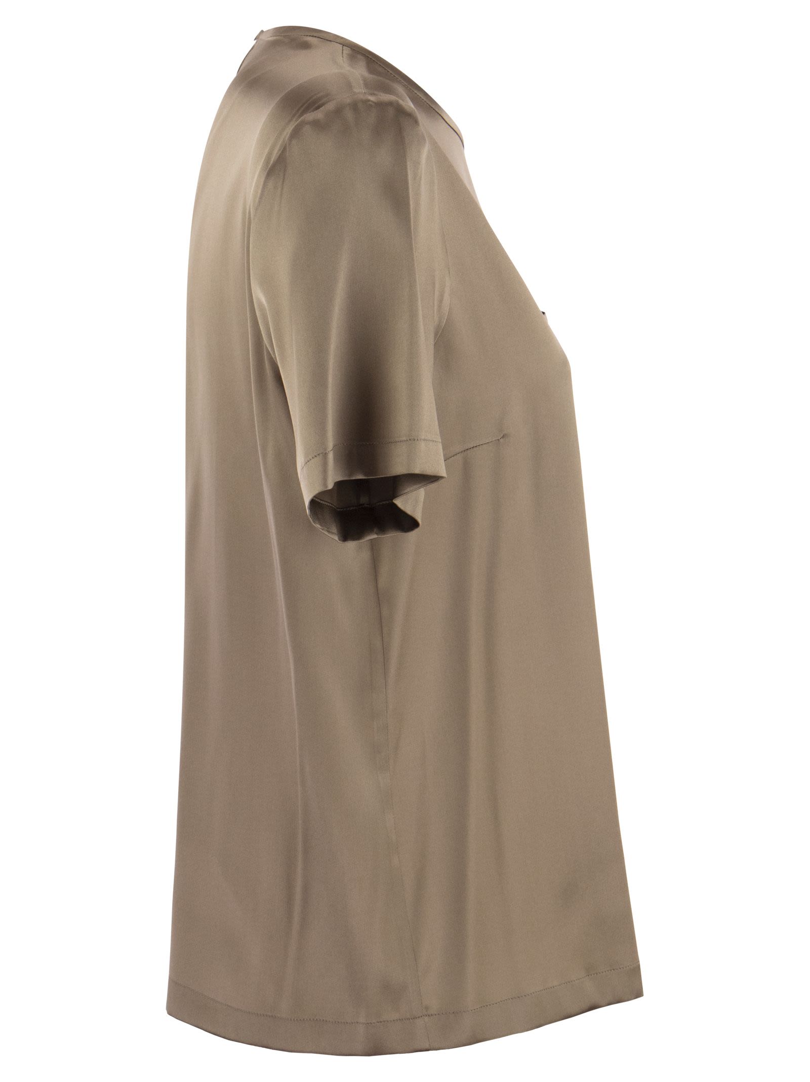 Elegant t-shirt with a flowing line in precious stretch silk satin. The round neckline and patch pocket give a sporty touch to the garment. The Punto Luce that illuminates the front and the button fastening on the back of the neck emphasise its refined nature. - T-shirt with round neckline - Short sleeve - Patch pocket - Stitch light detail - Regular fit - Drop and button fastening on the back DESIGNER ID: S06911 02372 648