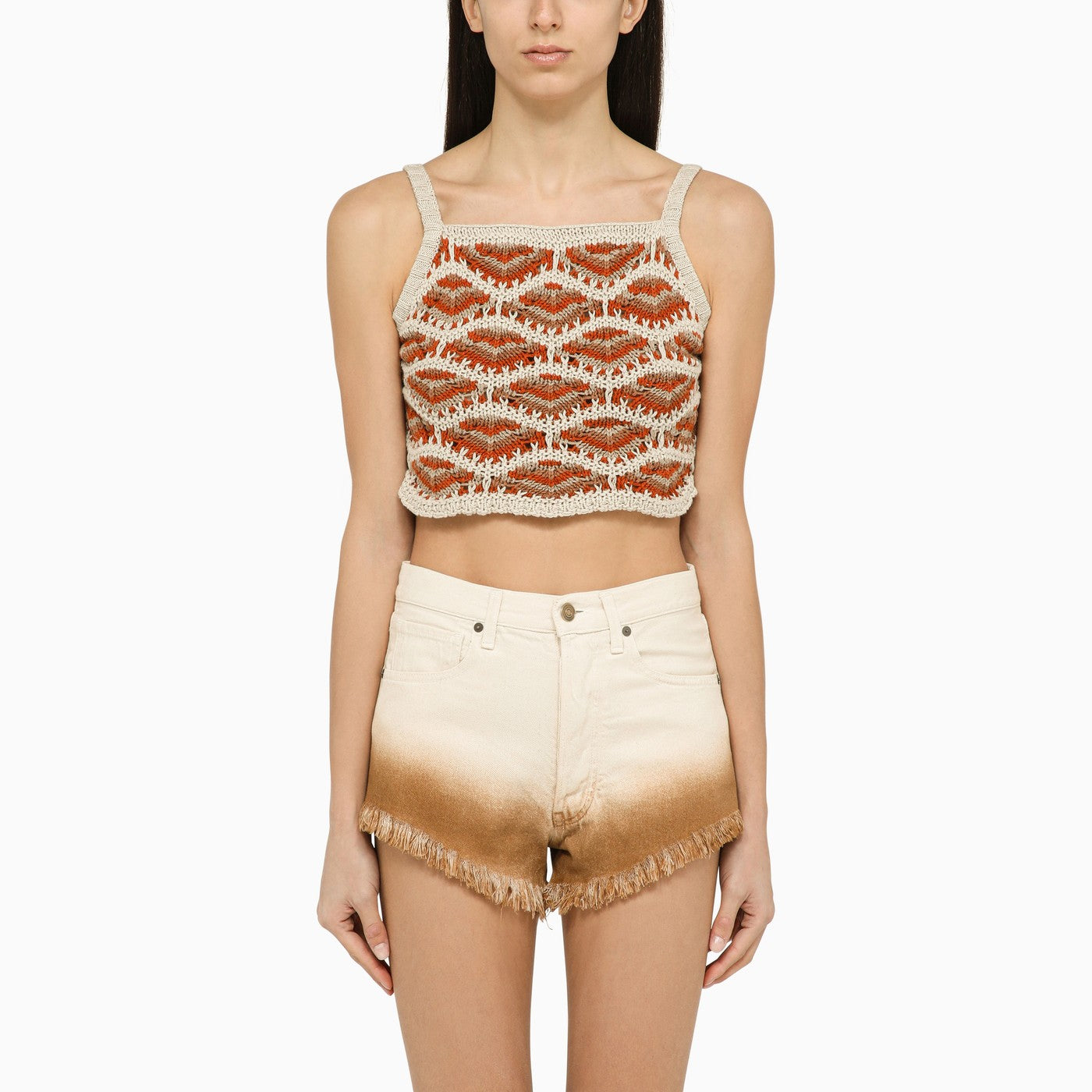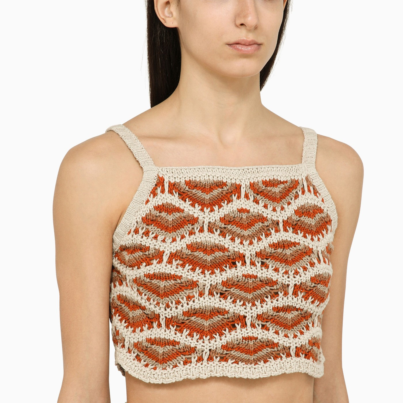 Multicoloured linen and cotton short top by Alanui features crochet work and a square neckline.