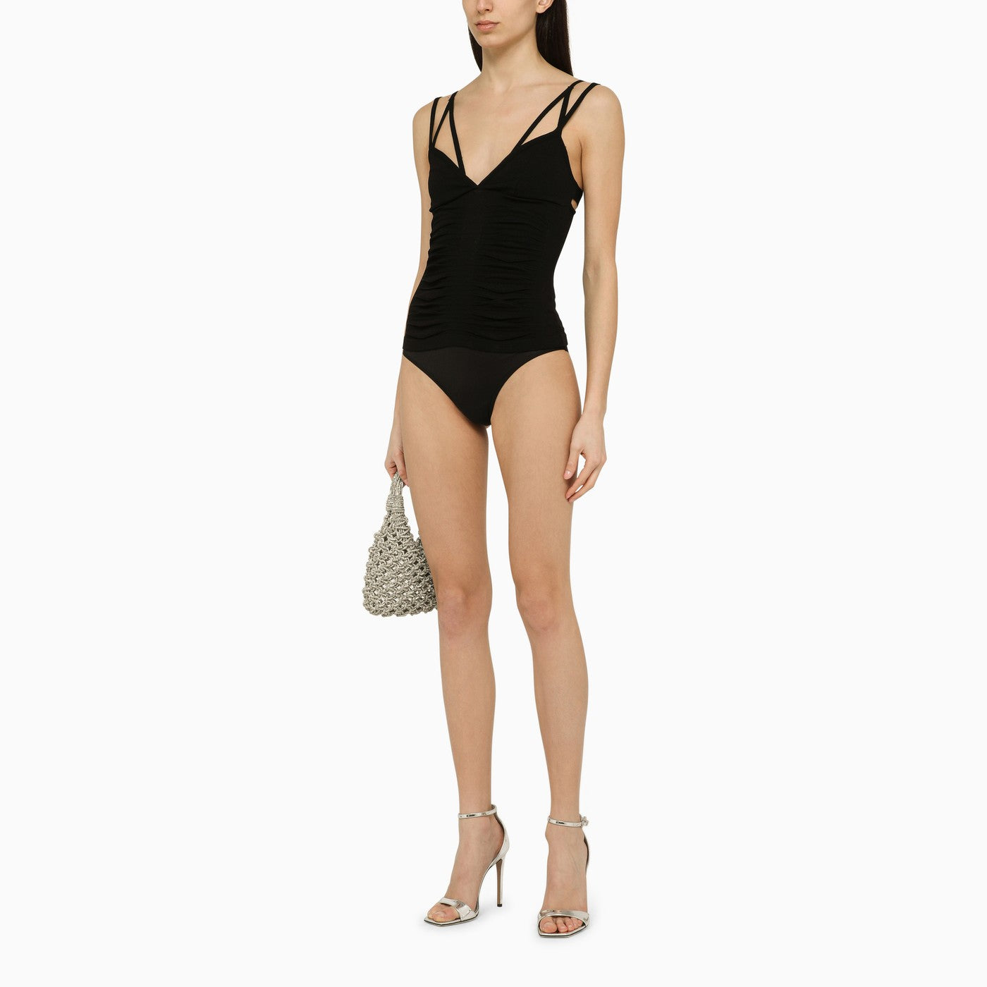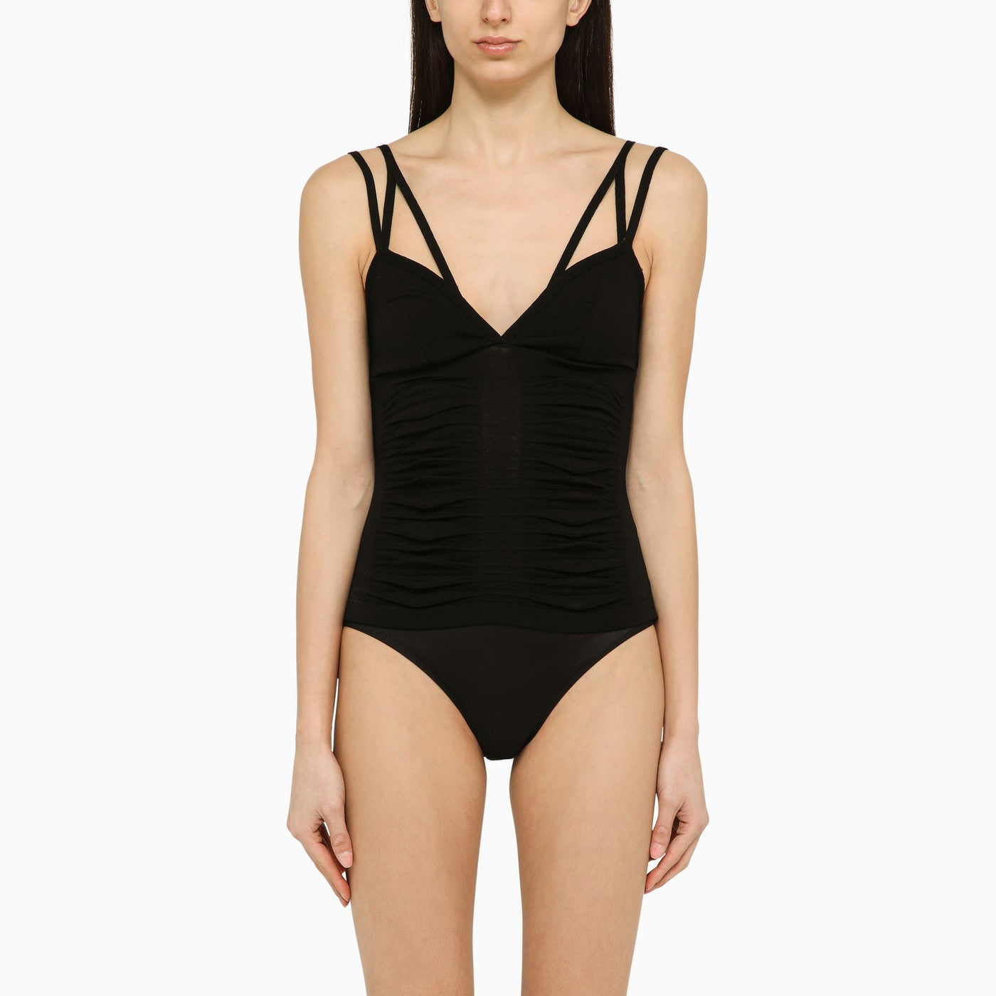 Black viscose-blend top by Andrea Adamo features a V-neck with double straps and front and back gathers.