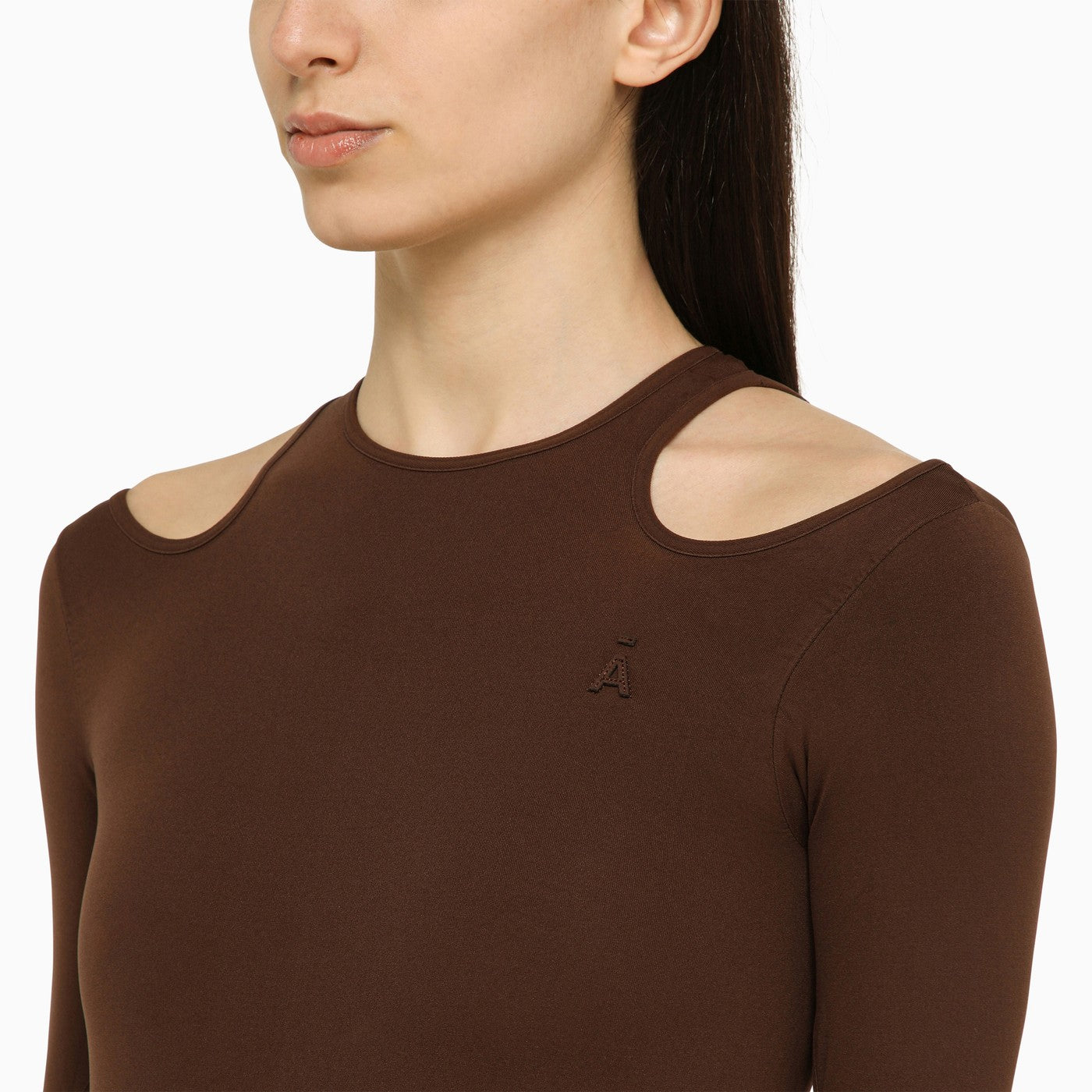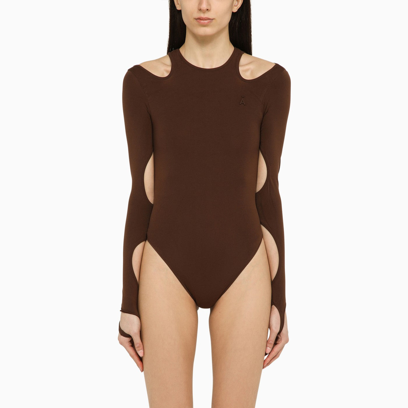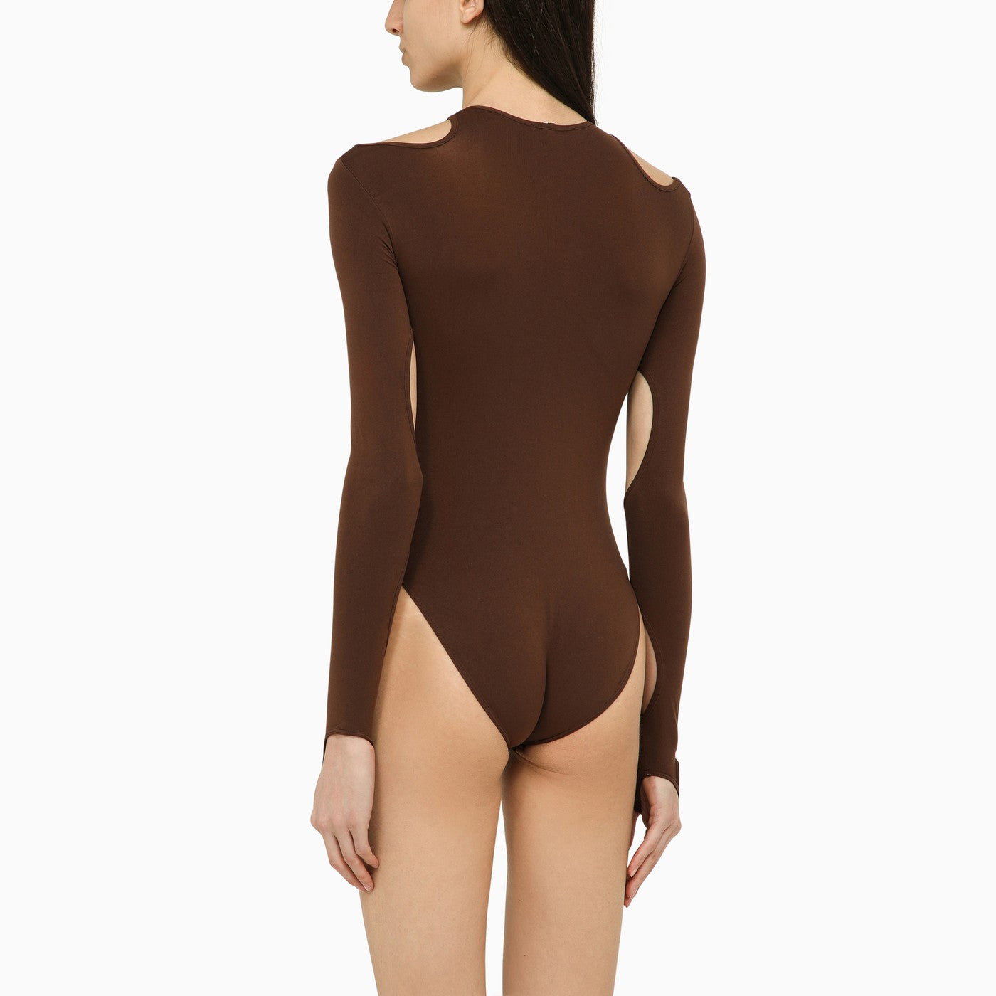 Brown nylon crewneck bodysuit by Andrea Adamo features long sleeves and cut-out details.