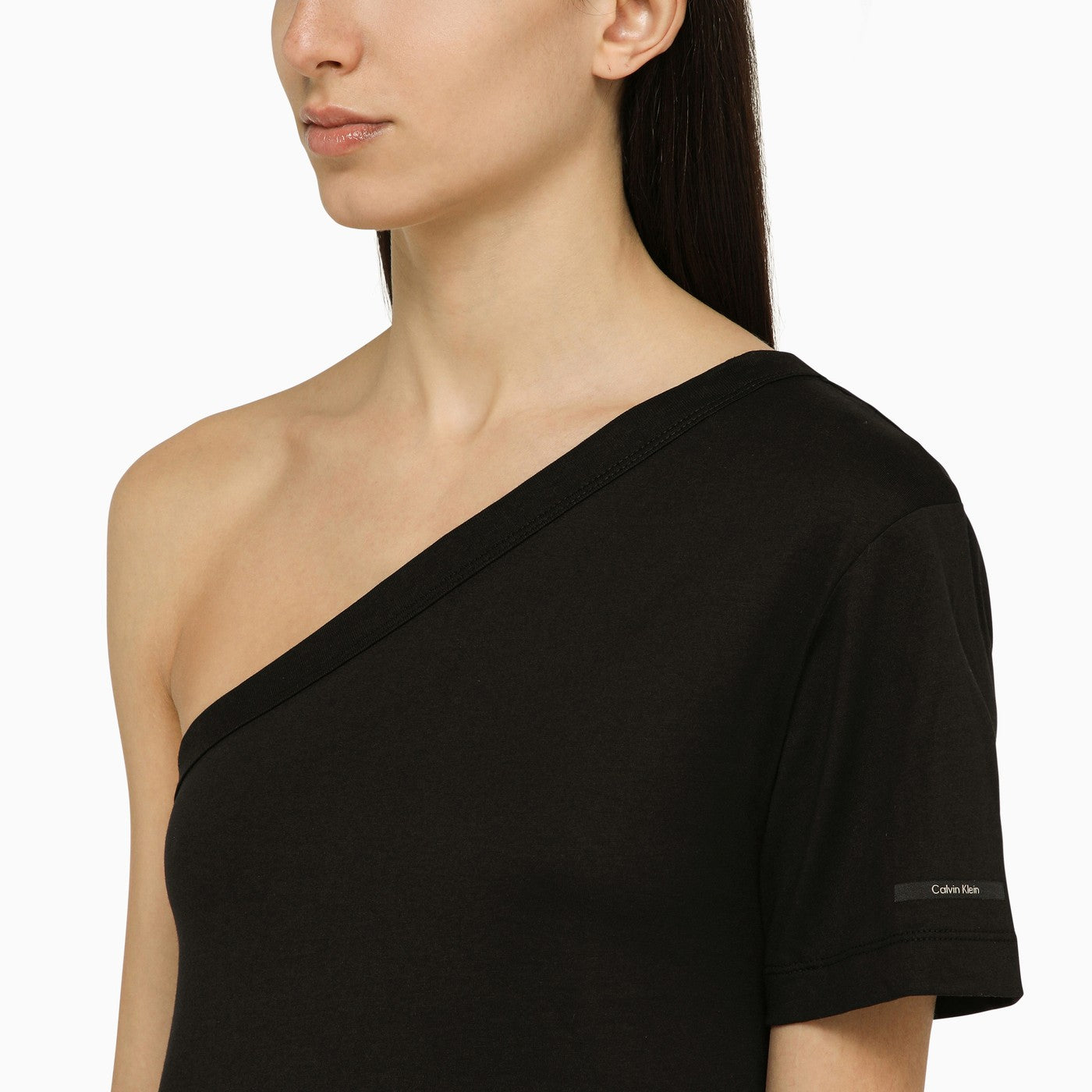 Black cotton one-shoulder T-shirt from Calvin Klein featuring short sleeves with logo lettering and straight hem.