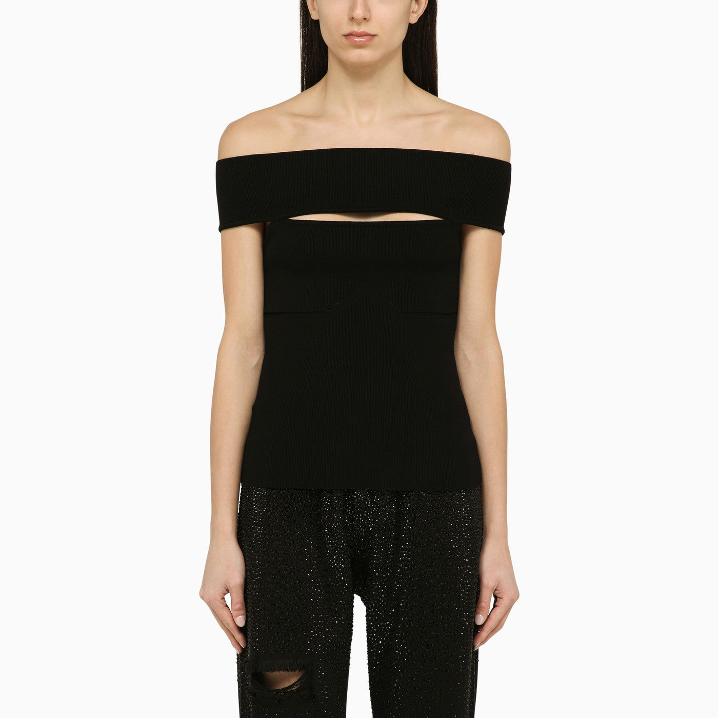 Black viscose blend top by Federica Tosi featuring open shoulders, cut-out front and back, ribbed design and straight hem.