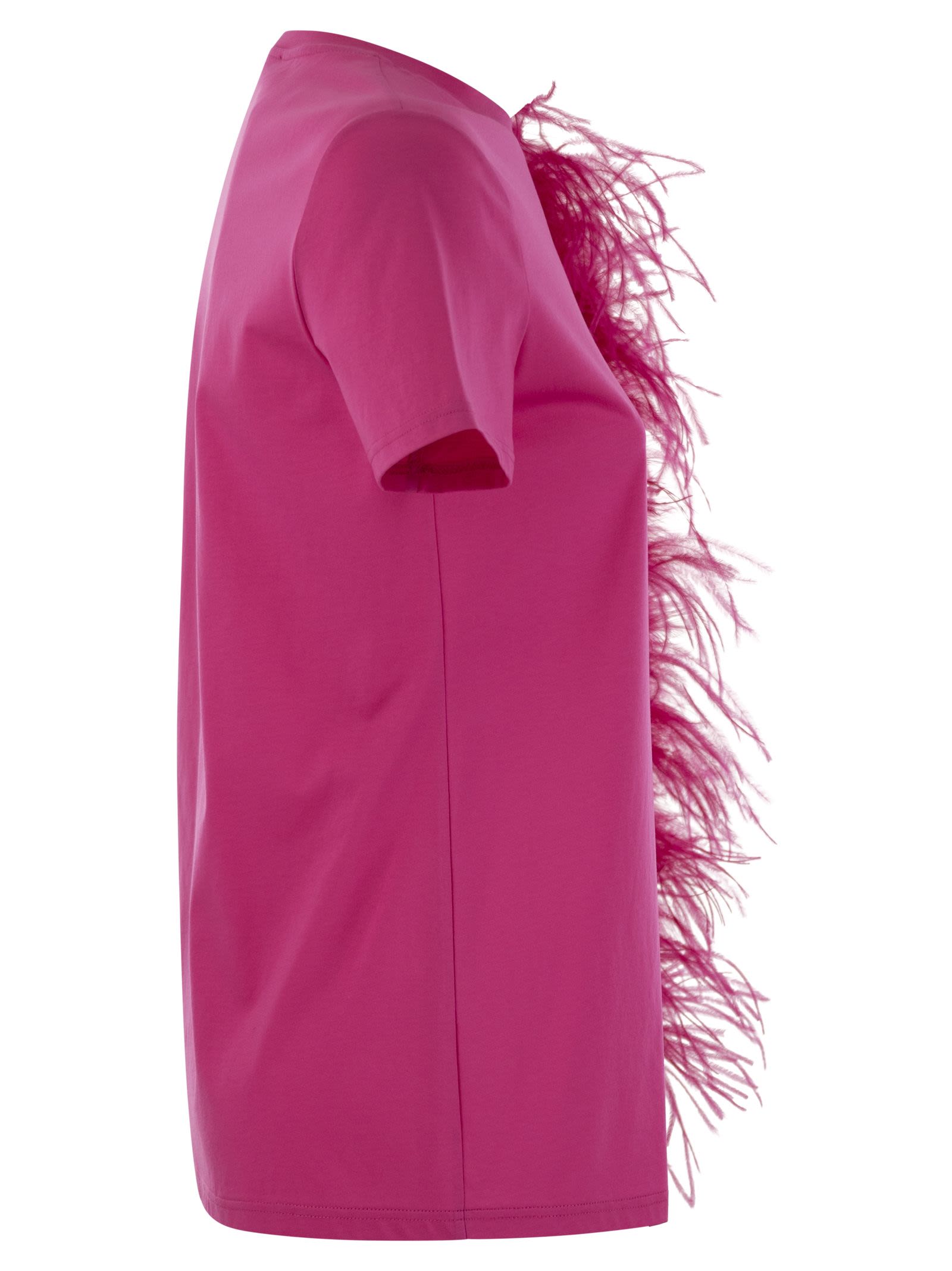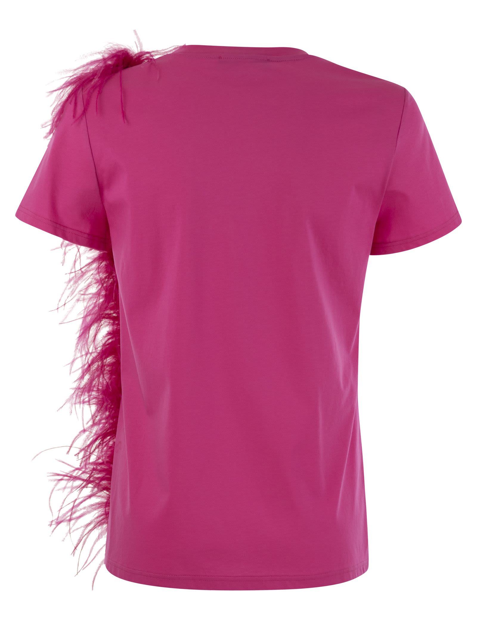 T-shirt in soft pure cotton jersey with round neckline and short sleeves. The model is embellished on the side with very light feathers, applied and removable, in the same shades. - Finished with Max Mara Studio logo embroidered on the back of the neck with micro rhinestones - Short sleeves - Regular fit DESIGNER ID: 2416941014600 001