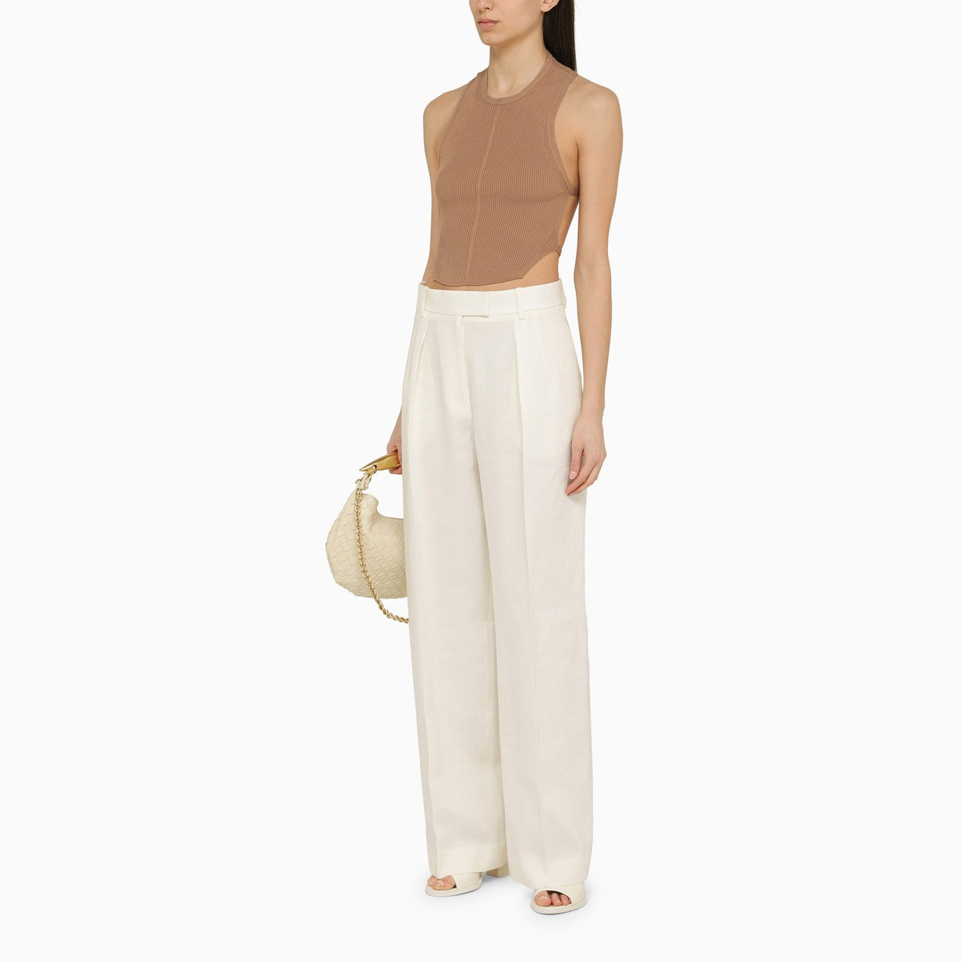 Light brown viscose blend sleeveless crew neck top by Philosophy by Lorenzo Serafini features a ribbed design and an open back with gold detail.
