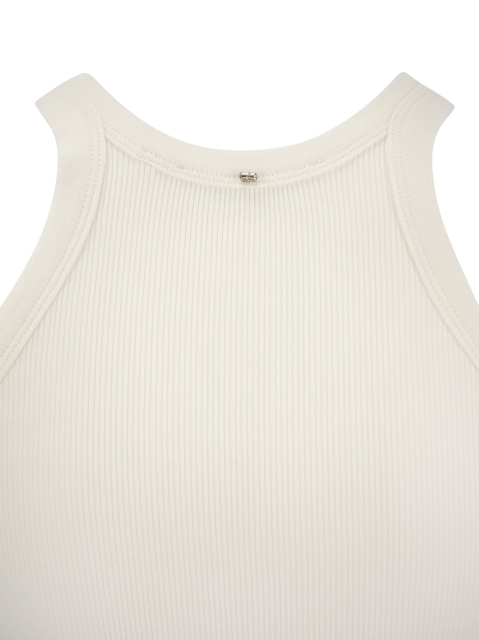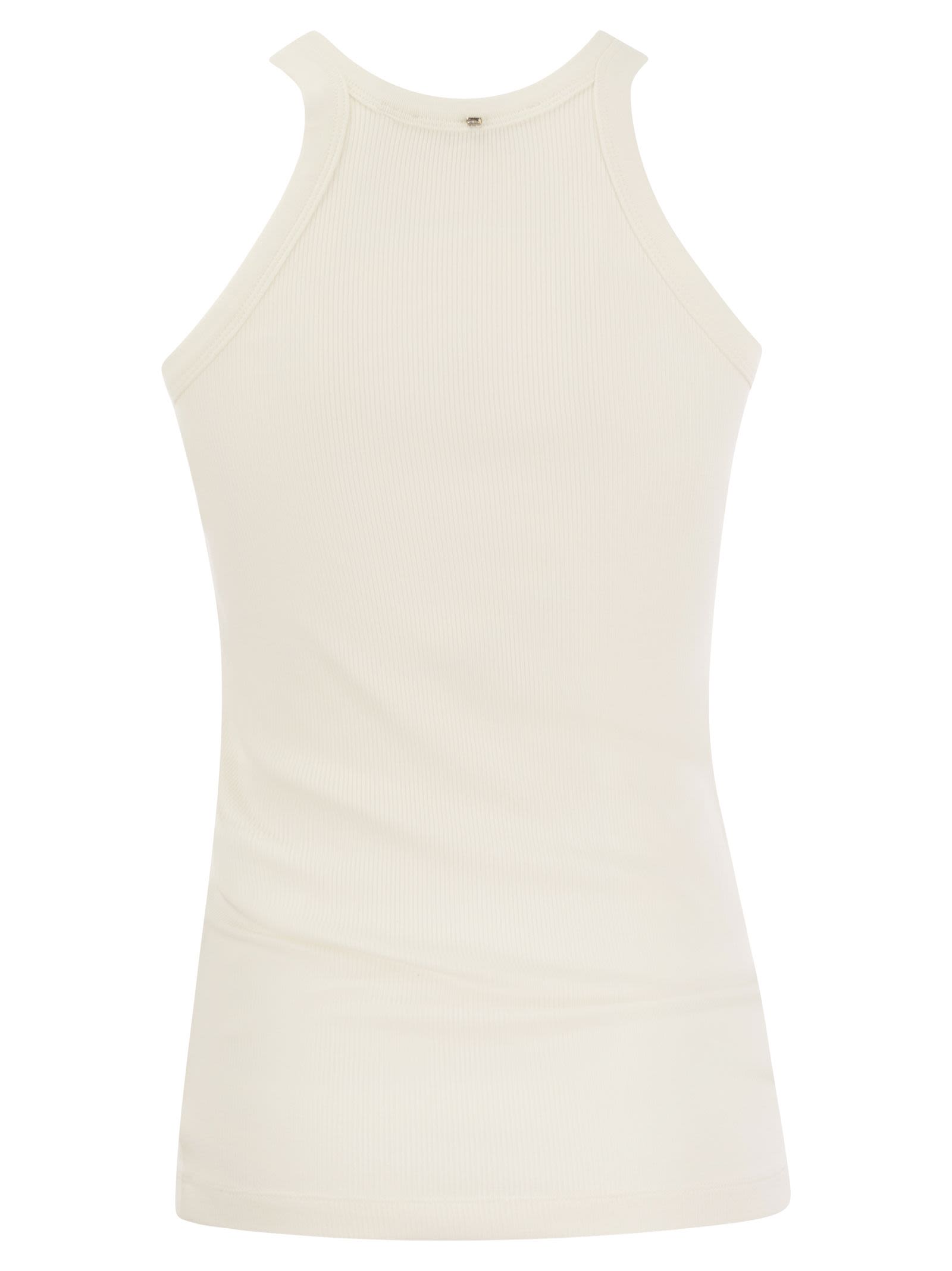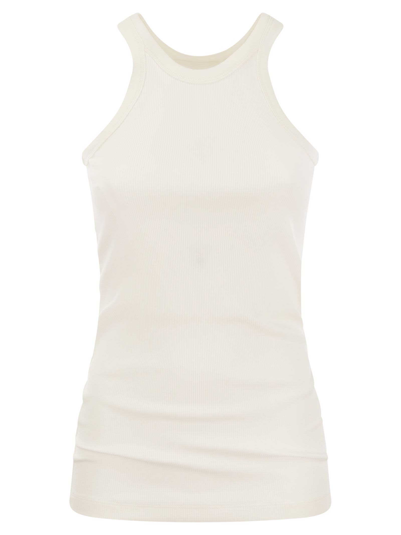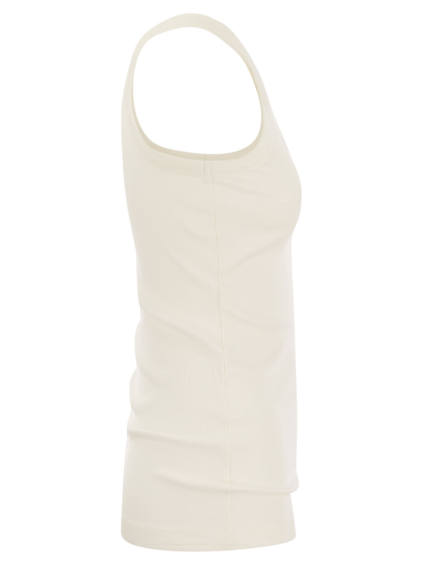Fitted tank top in ribbed jersey, made from cotton and silk yarn. Feminine volume, with rounded neckline and ribbed braces. - Sleeveless - Tight fit DESIGNER ID: 2412941011600 004