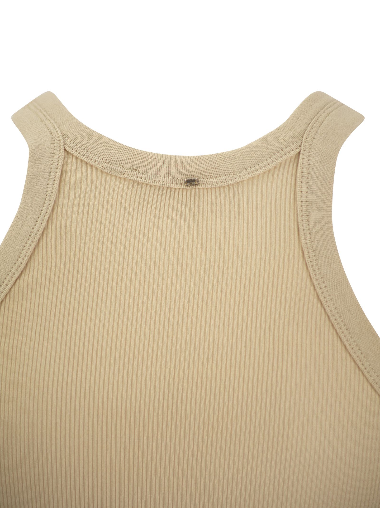 Fitted tank top in ribbed jersey, made from cotton and silk yarn. Feminine volume, with rounded neckline and ribbed braces. - Sleeveless - Tight fit DESIGNER ID: 2412941011600 002