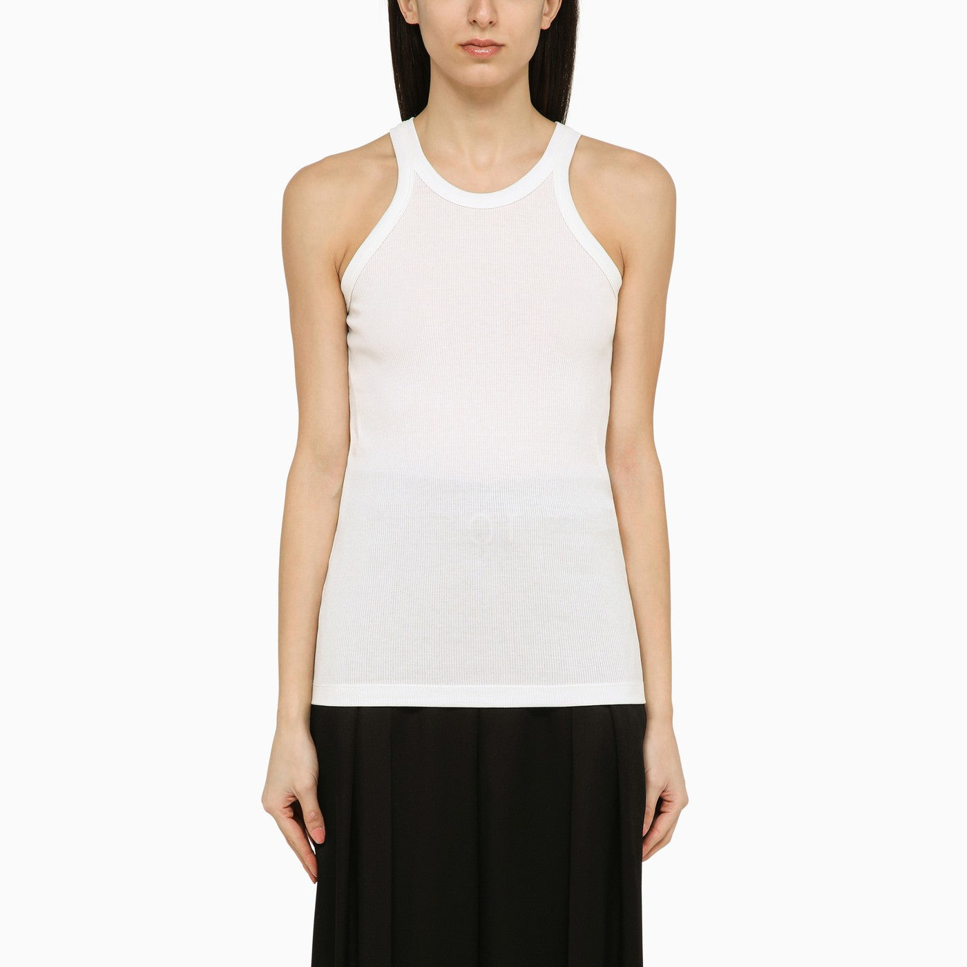 White cotton sleeveless crew-neck tank top by Sportmax features a ribbed design, a straight hem and a small bead detail sewn onto the back.