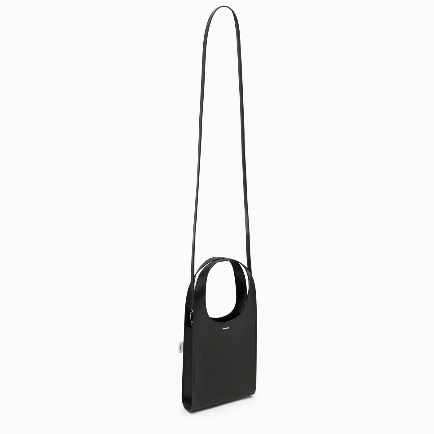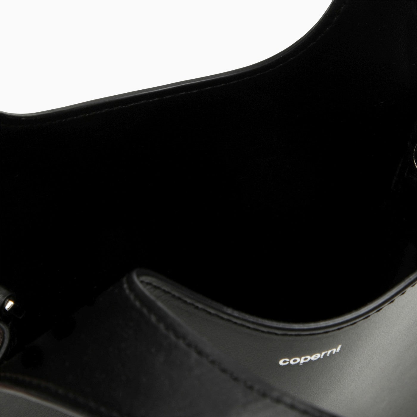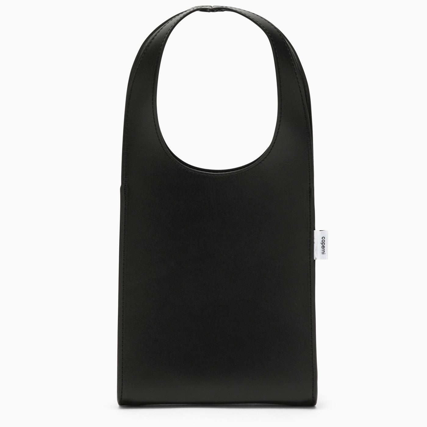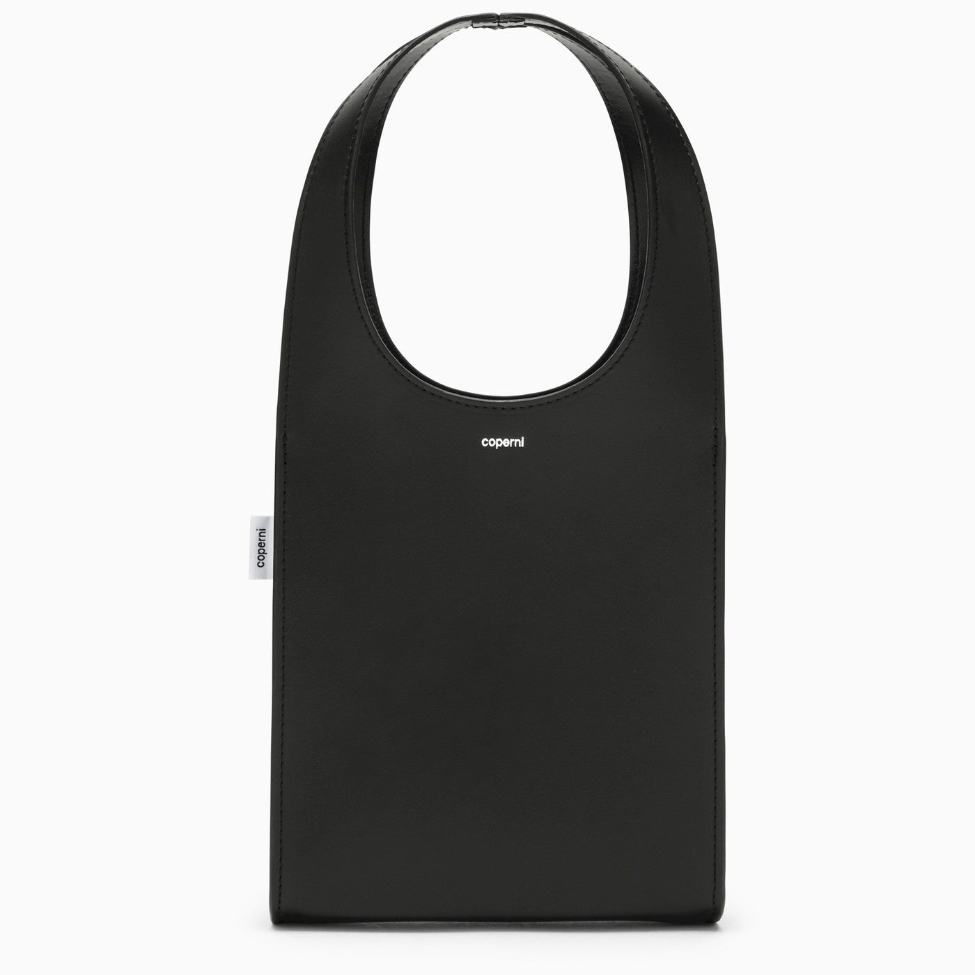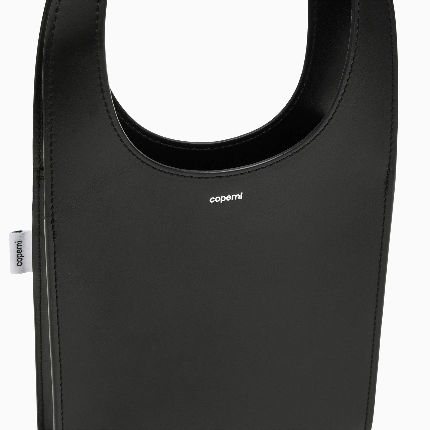 Black leather micro bag from Coperni featuring an open design, external logo plaque, contrasting front lettering, single compartment and removable shoulder strap.
