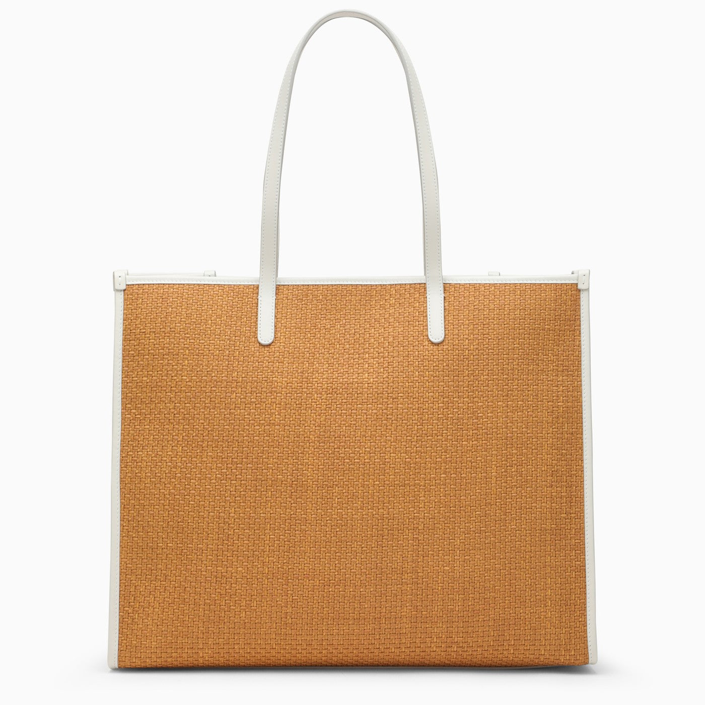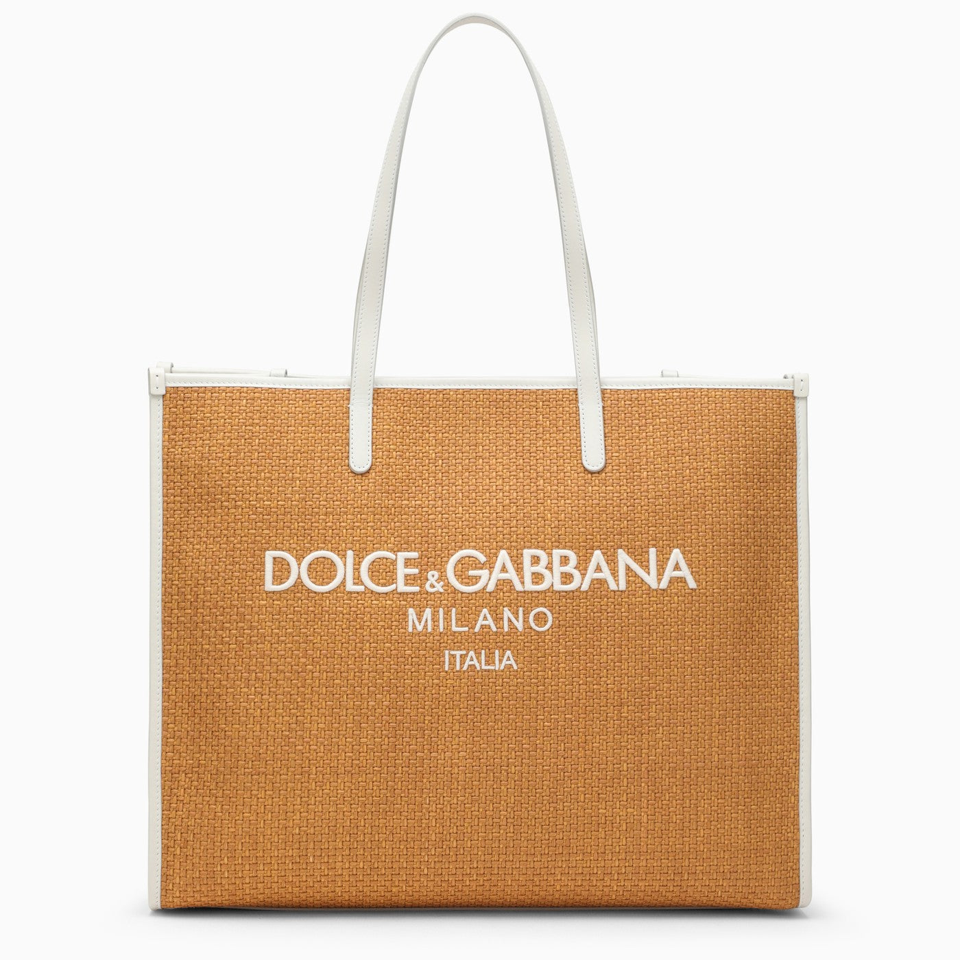 Large honey-coloured woven raffia shopping bag from Dolce & Gabbana featuring leather details, contrasting front lettering logo, magnetic button closure, calfskin top handles, and interior zipper pocket.