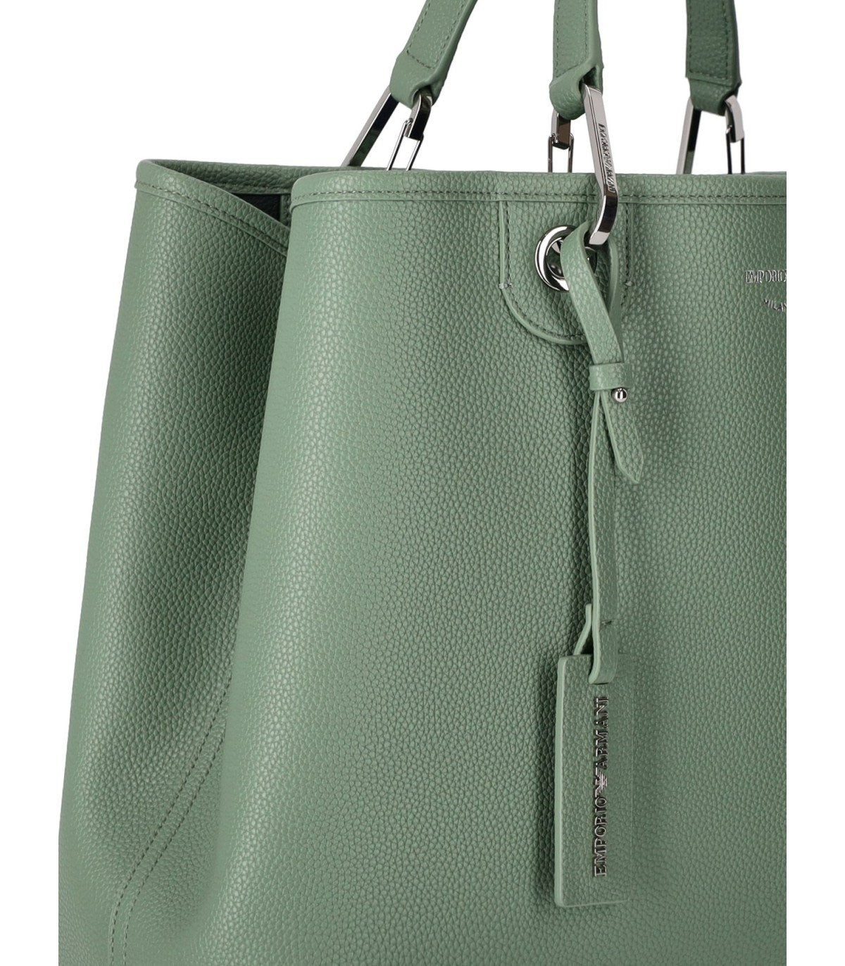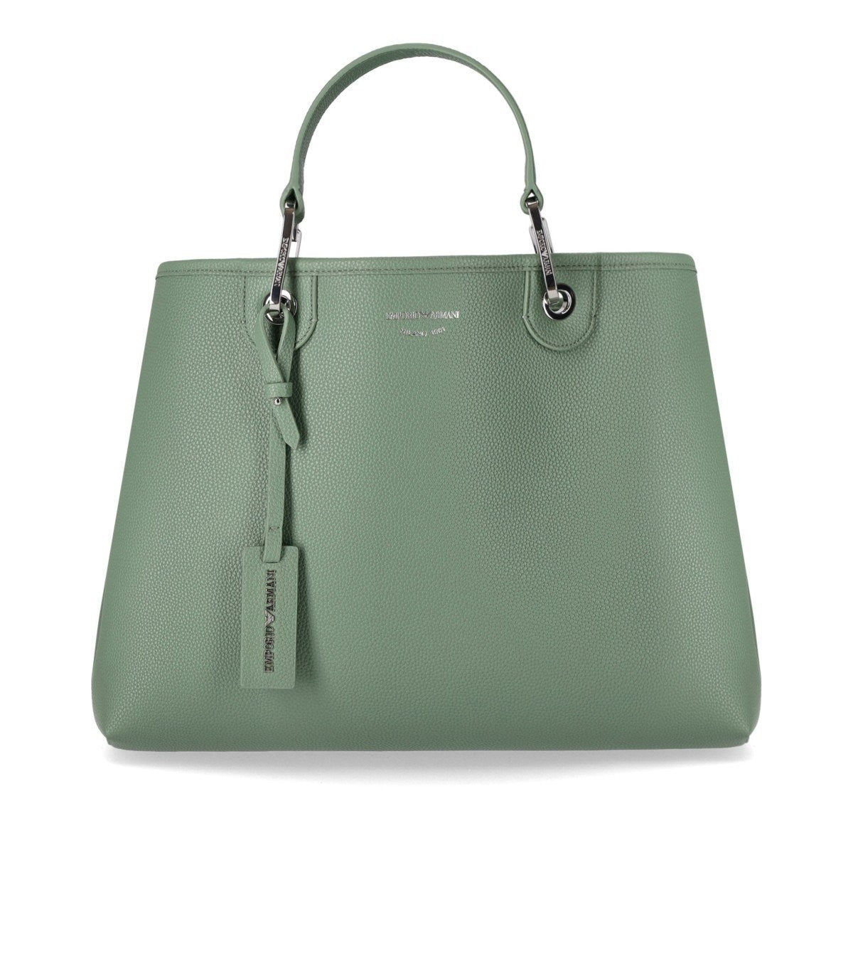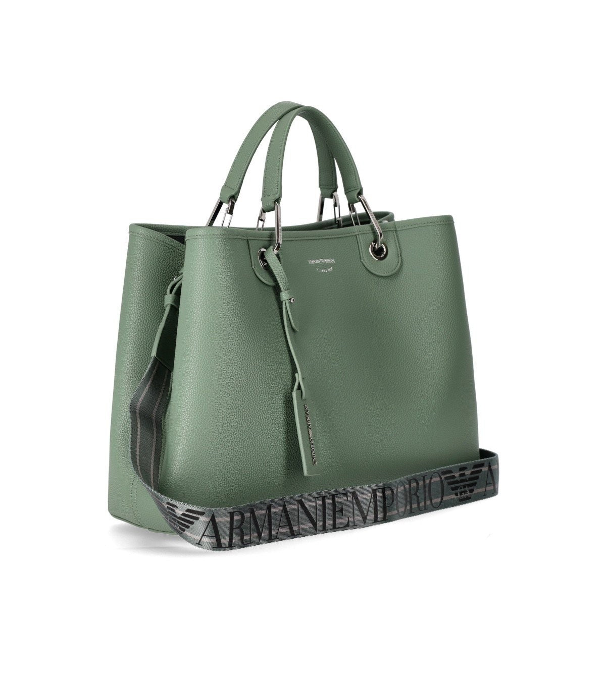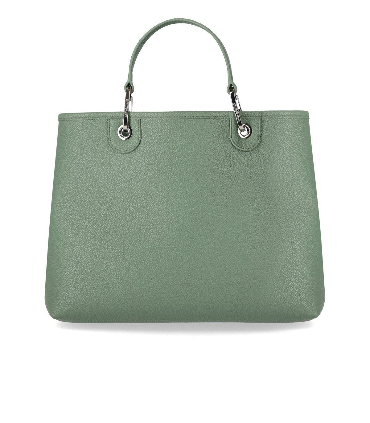 MyEA shopping bag from Emporio Armani made of sage green faux leather. Interior equipped with a detachable pouch with zip, adjustable and removable logo fabric shoulder strap and top handles with carabiners. Silver metal details and front logo. Magnetic closure, measures 37.5x27x11.5 cm. Composition: 100% polyurethane.