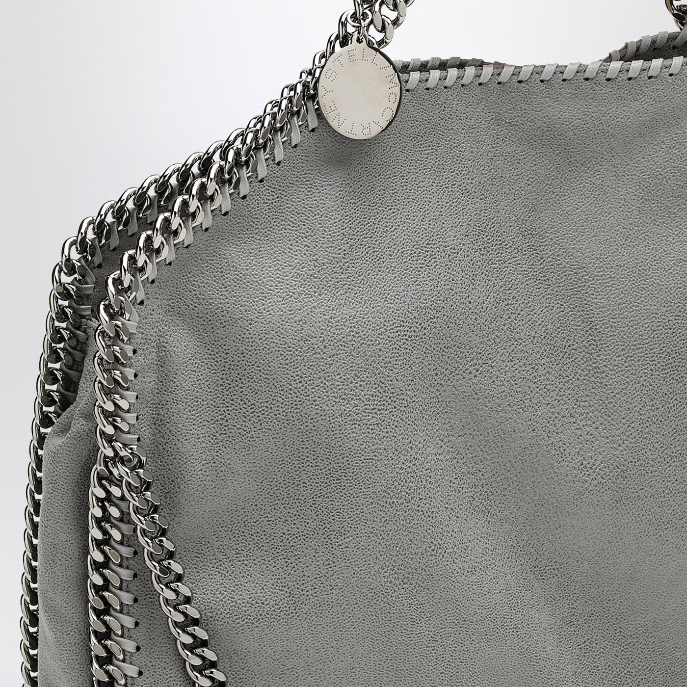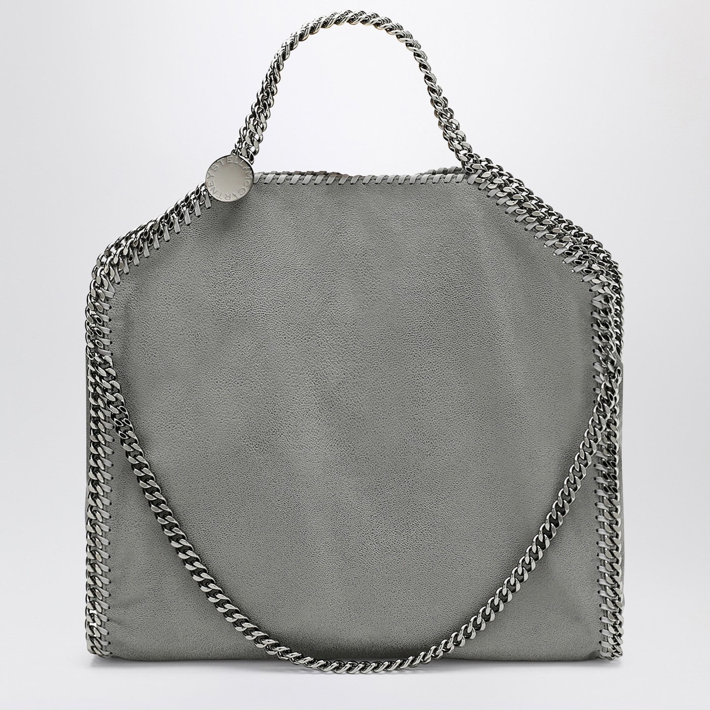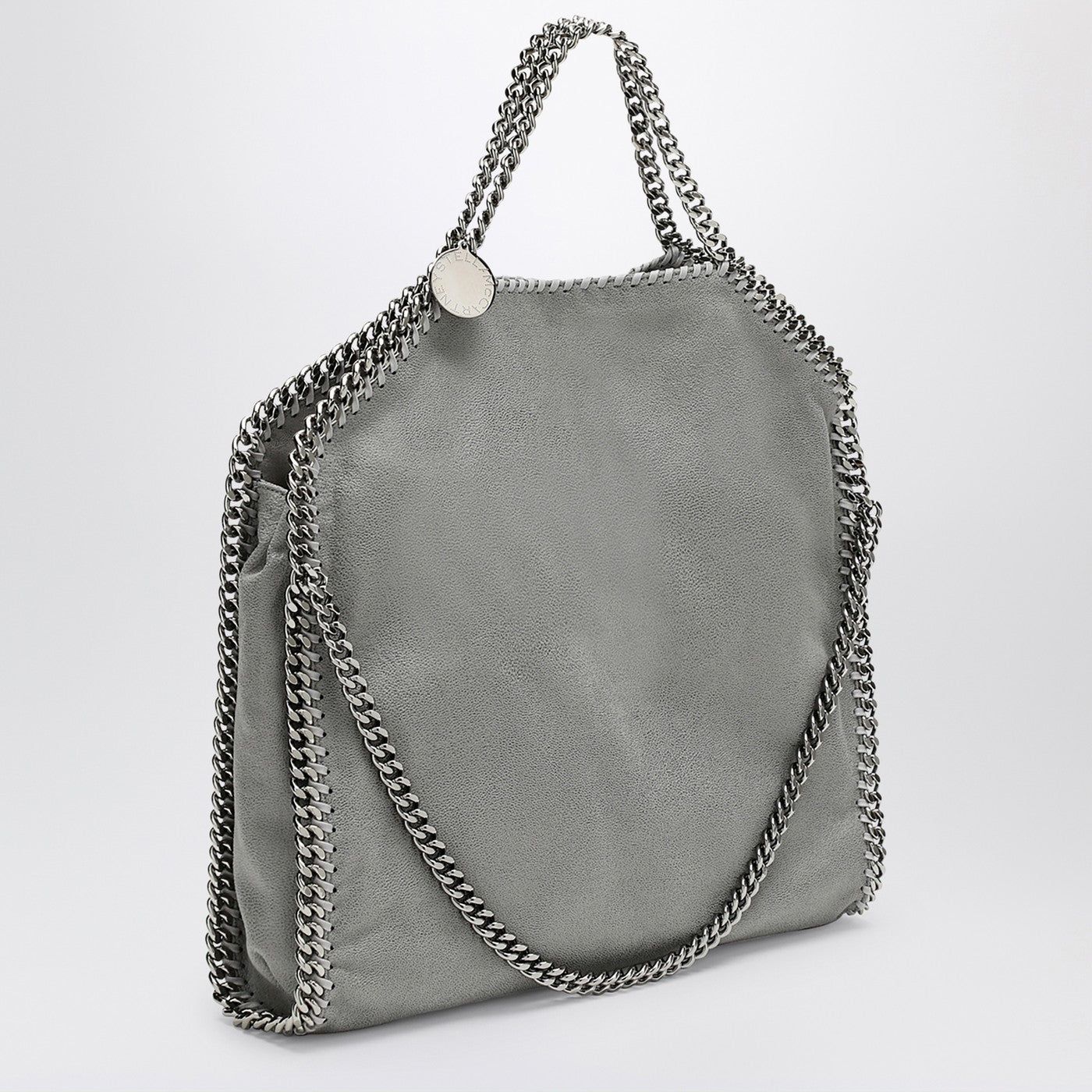Tote bag by Stella McCartney in grey shaggy deer with ruthenium chain and medal with Stella McCartney logo and inside pocket and snap closure on the top. It can be worn in two ways, folded and carried on the shoulder or as a hand bag.