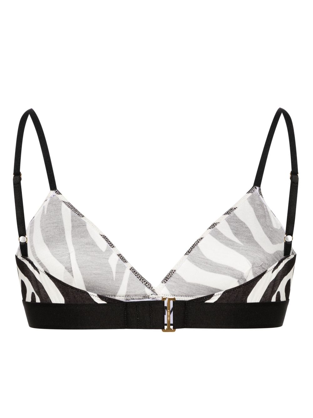 White/black, stretch mesh, zebra print, elastic band with logo, triangular cup, adjustable thin straps, hook fastening at the back, square open at the back.