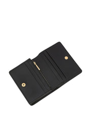 Black, calfskin, gold-tone logo plaque, bi-fold design, concealed snap button closure, internal card slots, internal zip pocket and internal banknote compartment.