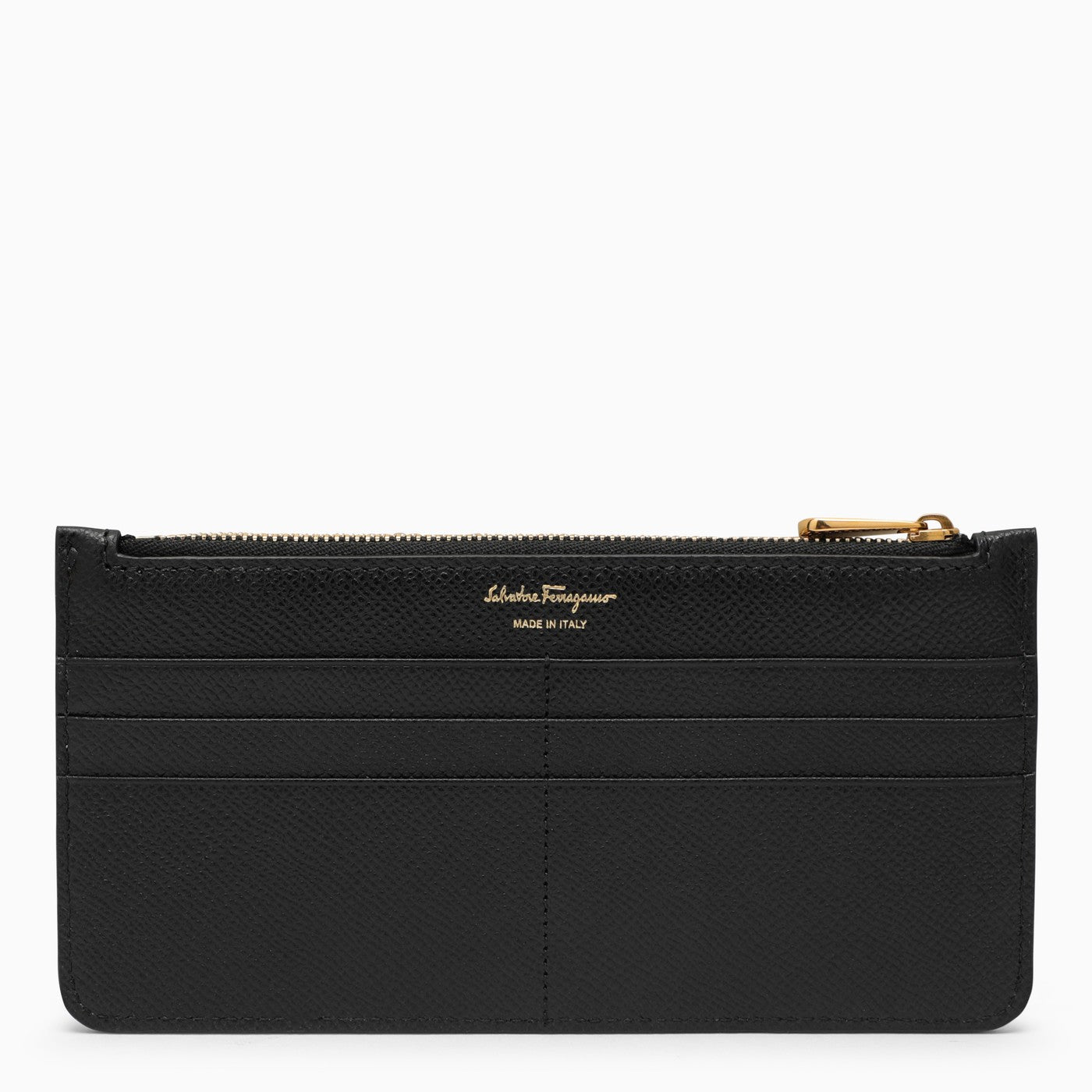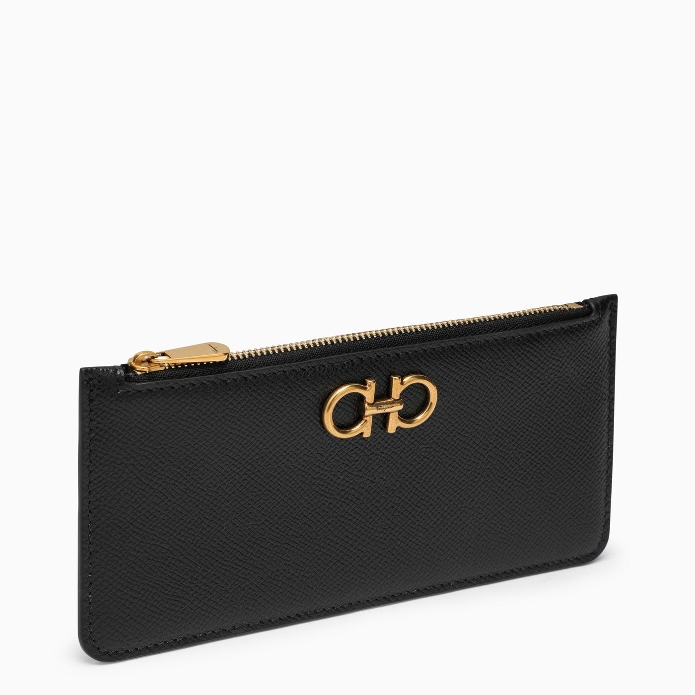 Card case by Salvatore Ferragamo in black leather featuring a metal Gancini detail with a gold finish on the front, a zipped compartment and six card slots on the back.