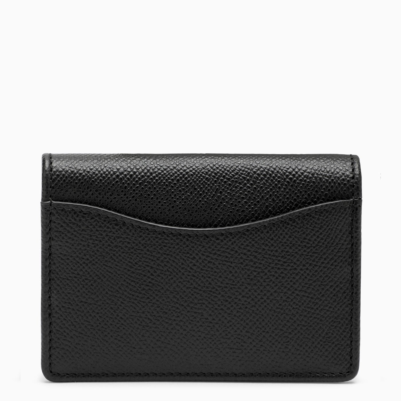 Business card holder by Salvatore Ferragamo in black grained leather featuring a snap fastening with gold-tone metal Gancini detail, a key holder with chain, two internal compartments and a welt pocket on the back.